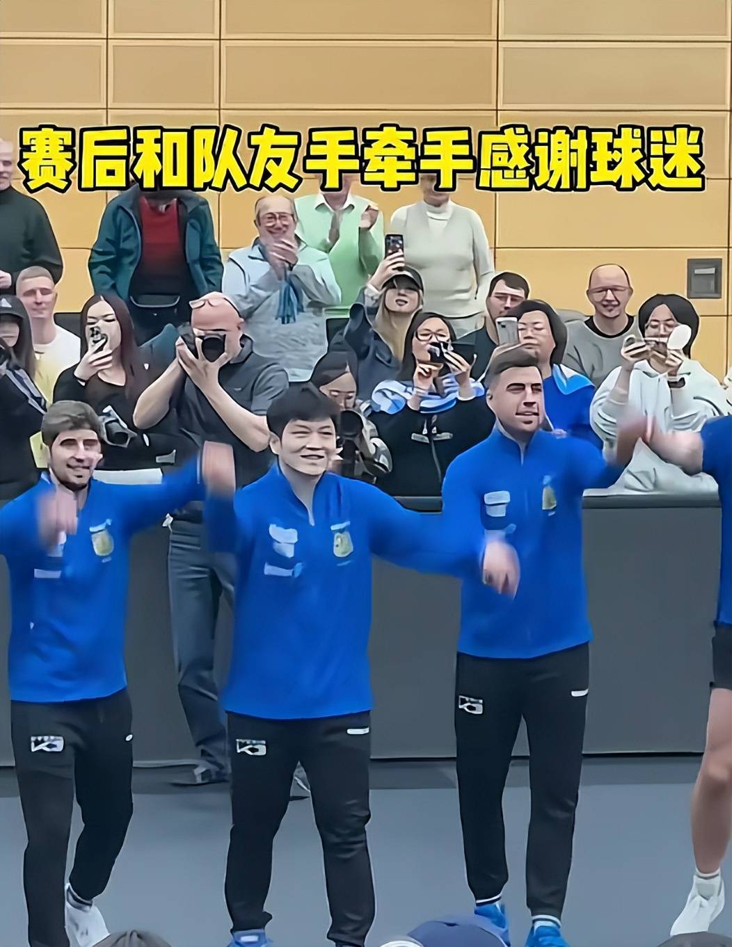 แฟน เจ๋อดง และเพื่อนร่วมทีมของเขาจับมือกันและโค้งคำนับต่อผู้ชม แสดงความยินดีที่ดูเหมือนจะกระโดดออกมาจากหน้าจอ