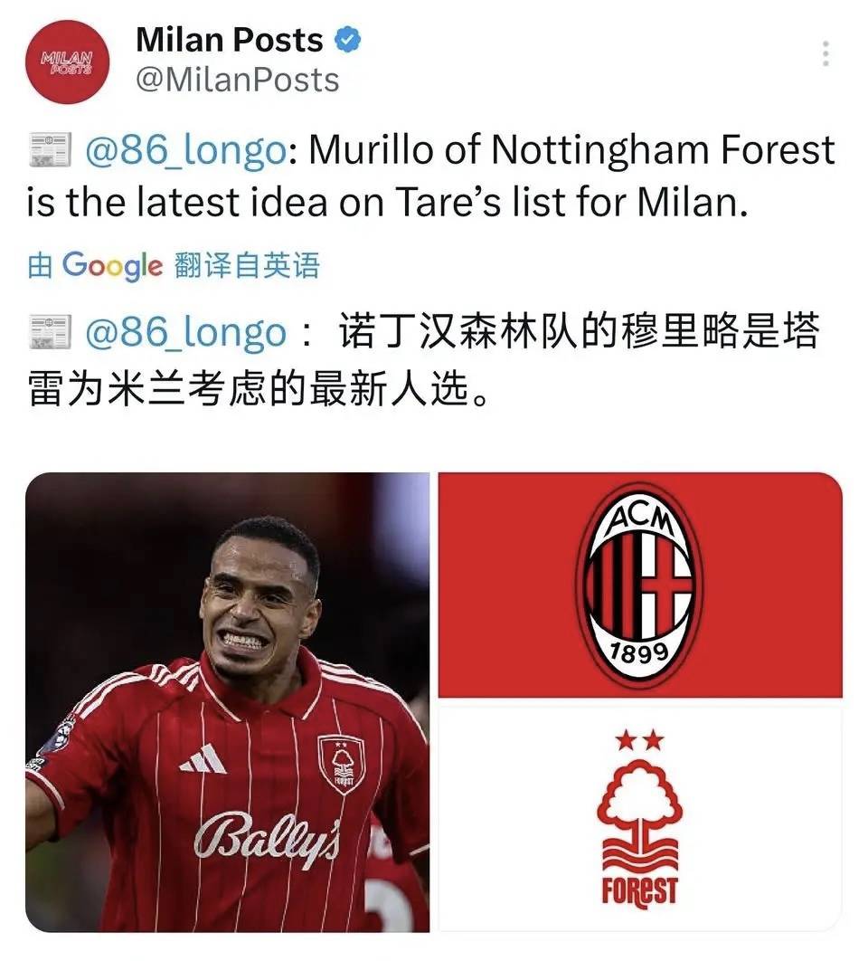 มูริลโล! ผู้อำนวยการกีฬาของเอซี มิลาน ปาโอโล ตาเร ได้สอบถามเกี่ยวกับกองหลังชาวบราซิลของน็อตติงแฮม ฟอเรสต์ มูริลโล น็อตติงแฮม ฟอเรสต์ ได้บ่งชี้ว่าพวกเขายินดีที่จะขายมูริลโล แต่ราคาต้องไม่ต่ำกว่า 50 ล้านปอนด์