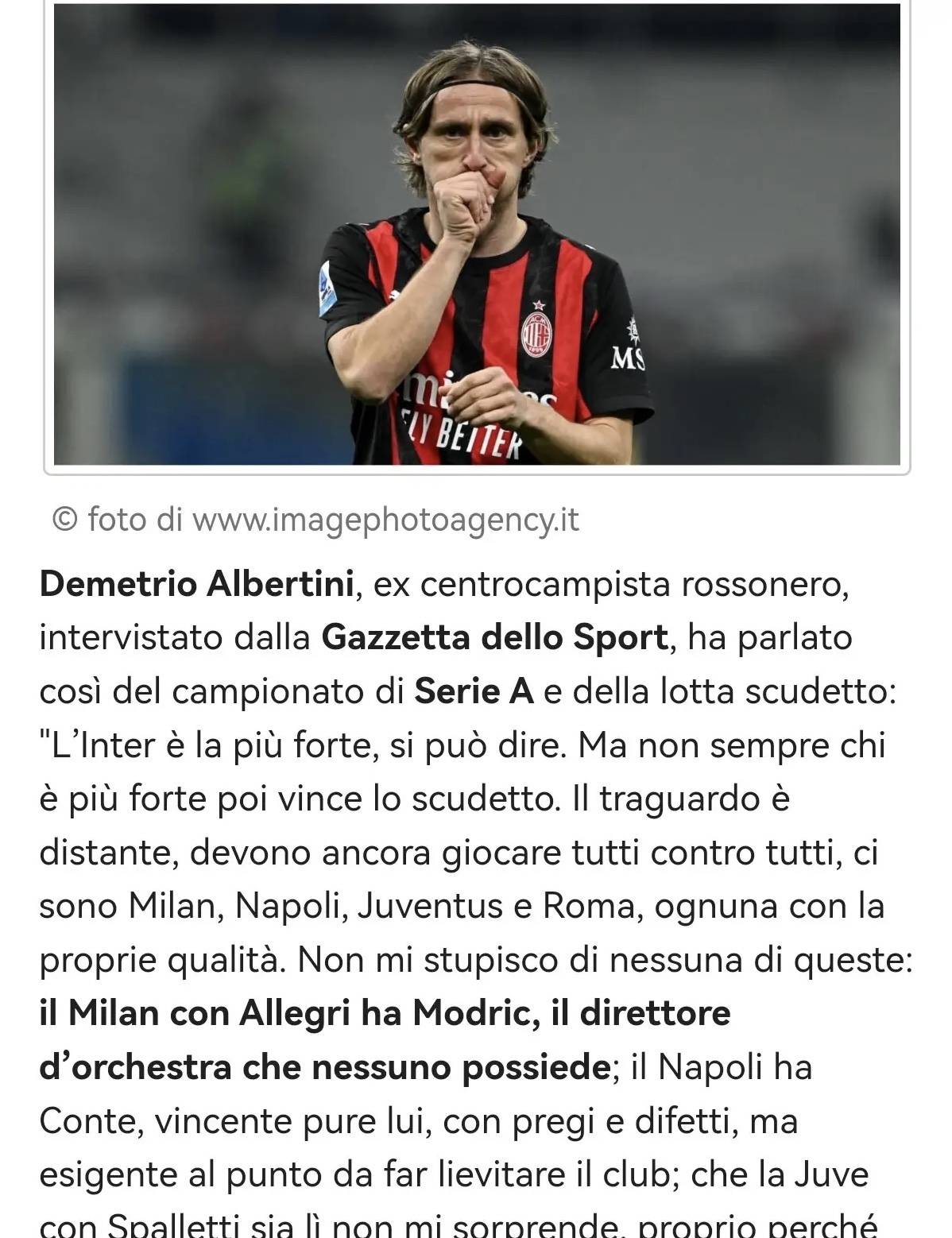 เดเมทริโอ อัลแบร์ตินี อดีตกองกลางของเอซี มิลาน ได้แสดงความคิดเห็นเกี่ยวกับเซเรีย อา และการแข่งขันชิงแชมป์ในบทสัมภาษณ์กับ กัซเซ็ตต้า เดลโล สปอร์ต: "อาจกล่าวได้ว่า อินเตอร์ มิลาน เป็นทีมที่แข็งแกร่งที่สุดในขณะนี้ แต่ทีมที่แข็งแกร่งที่สุดไม่จำเป็นต้องคว้าแชมป์ในท้ายที่สุด เส้นชัยของฤดูกาลยังอยู่ไกลมาก และทุกทีมยังต้องเผชิญหน้ากันอีก มิลาน, นาโปลี, ยูเวนตุส และโรม่า ต่างก็มีข้อได้เปรียบของตัวเอง"