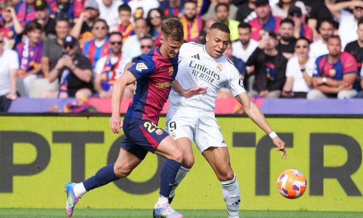 เรอัล มาดริด, ผู้ชนะแชมเปียนส์ลีก 15 สมัย, เฉือนชนะบาร์เซโลนา 2-1 เพื่อยุติการแพ้ติดต่อกันสี่นัดและขยายการนำเป็นห้าคะแนนในการแข่งขันชิงแชมป์_คีเลียน เอ็มบัปเป้_การครองบอล_ลาลีกา