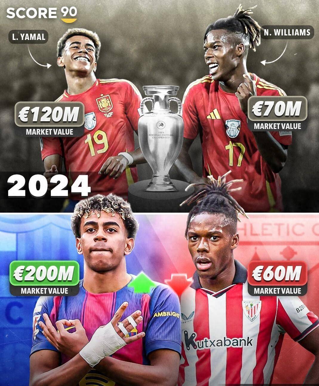 ย้อนกลับไปช่วงซัมเมอร์ของถ้วยยุโรปที่ชนะเมื่อสองปีก่อน ยามาลมีมูลค่า 120 ล้านยูโร และนิโคคือ 70 ล้านยูโร ในสองปี คนหนึ่งเพิ่มขึ้นจาก 120 ล้านเป็น 200 ล้าน และอีกอันลดลงจาก 70 ล้านเป็น 60 ล้าน นี่คือ 140 ล้านยูโรเต็มเกือบ 1 พันล้านหยวน