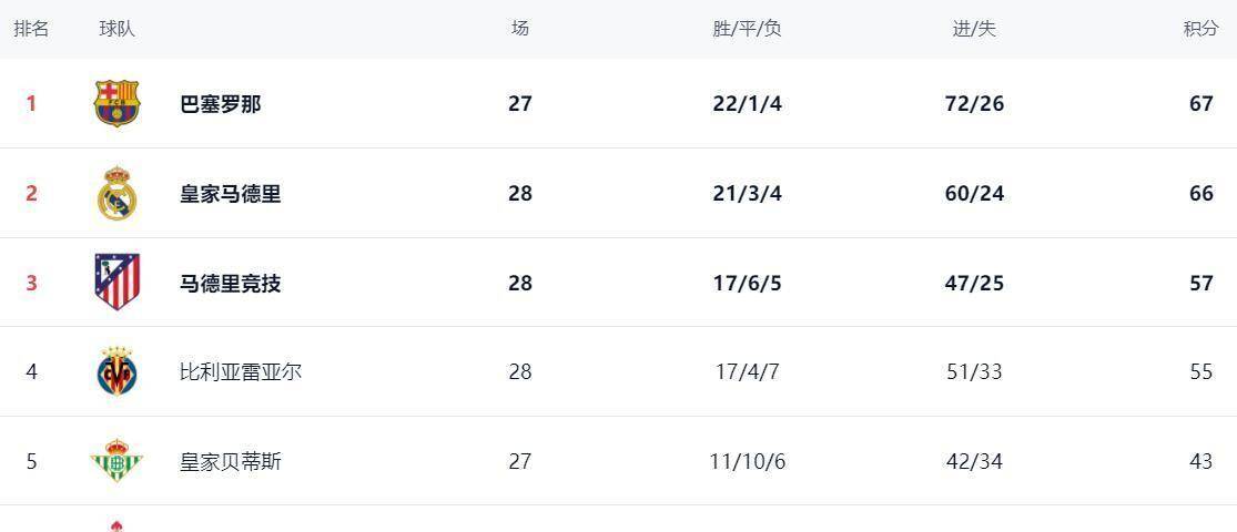 ในค่ำคืนนี้ อันดับ ลาลีกา ได้เปลี่ยนไปอีกครั้ง บาร์เซโลน่ายังคงเป็นบอส ชนะ 22 เสมอ 1 แพ้ 4 แต้ม 67 แต้ม เรอัล มาดริด 66 แต้มหลังชนะ ต่างกันแค่ 1 แต้ม! แต่ระวังนะ เรอัล มาดริด เล่นมากกว่าบาร์เซโลน่า อย่ามองเลย แค่ 1 แต้ม ความคิดริเริ่มยังอยู่ในมือของบาร์เซโลนา แอตเลติโก มาดริด 57 แต้มหลังจากชนะ ขึ้นเป็นอันดับสาม บียาร์เรอัล 55 แต้มที่สี่ เบติสที่ด้านหลังมีเพียง 43 แต้ม และโดยพื้นฐานแล้วมันไม่มีประโยชน์ที่จะไล่ตามสี่คนแรก