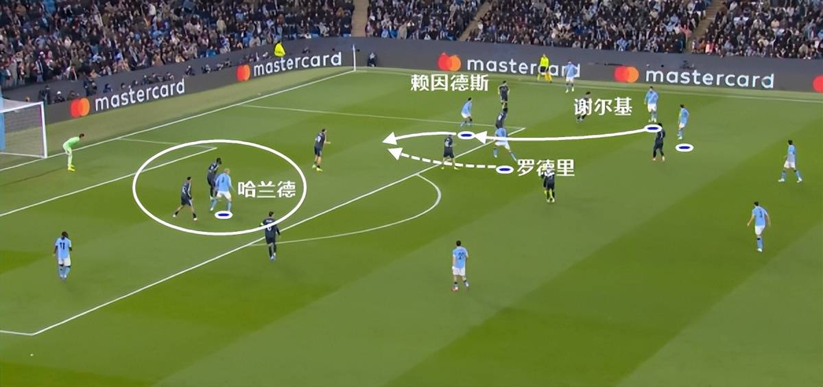 ใช้การ์ดของ Harland เพื่อควบคุมกองหลังของฝ่ายตรงข้าม แมนเชสเตอร์ซิตี้พบพื้นที่โจมตีสำหรับซี่โครง Shelkey เป็นจุดเริ่มต้นของการผ่าน และบังเหียนจะถูกสอดเข้าไปในซี่โครงเพื่อนำส่วนแทรกไปข้างหน้าของ Rodri