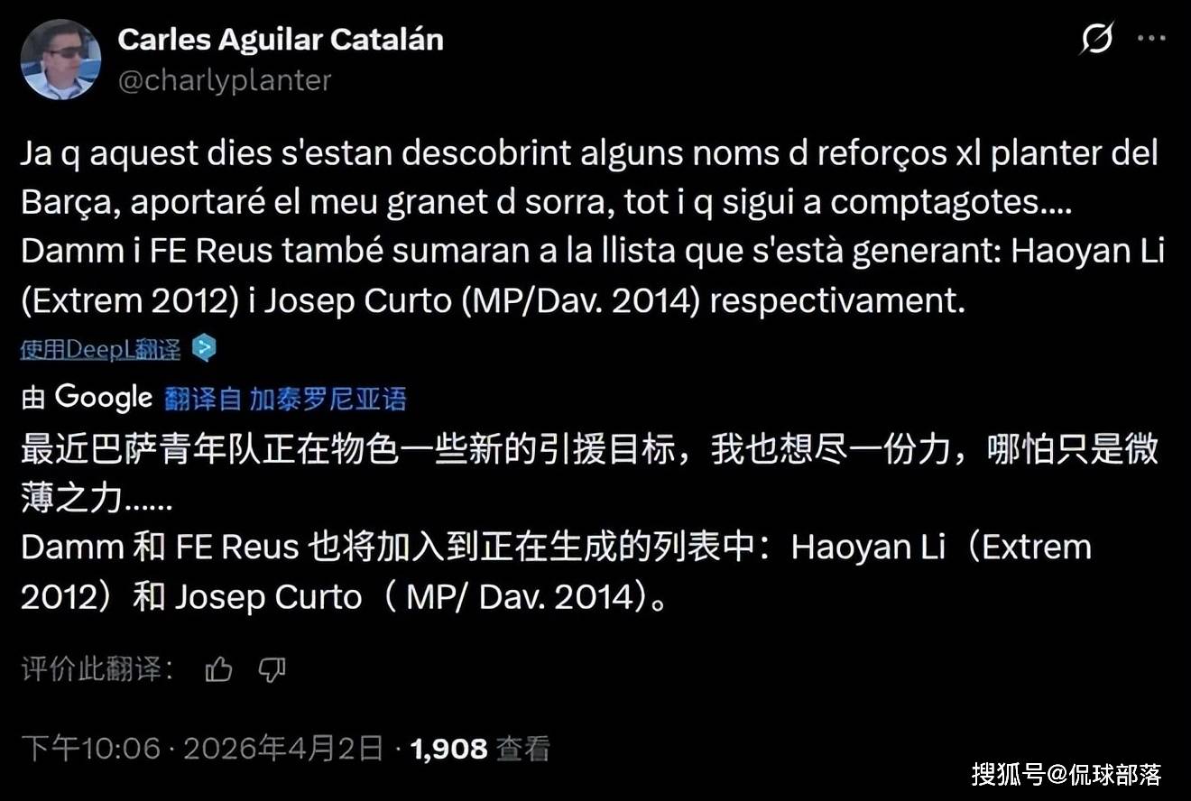 ในวันที่ 3 เมษายน ตามเวลาปักกิ่ง ข่าวล่าสุดจาก Carles Aguilar Catalán นักข่าวฝึกเยาวชนในภูมิภาคคาตาลัน จะเซ็นสัญญากับ หลี่ ฮาโอยัน วัยรุ่นชาวจีนวัย 14 ปี ซึ่งปัจจุบันกำลังเล่นให้กับเยาวชนของแดม ฤดูกาลหน้า Li Haoyan จะเป็นตัวแทนของการเล่นระดับบาร์เซโลนา U15 (เยาวชน B)