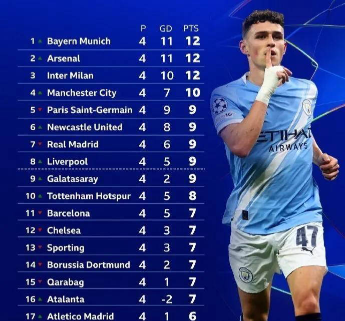 การแข่งขันยูฟ่าแชมเปียนส์ลีกได้ผ่านไปแล้วสี่รอบ โดยห้าทีมจากพรีเมียร์ลีกอยู่ในอันดับท็อปเท็นของตารางกลุ่ม อาร์เซนอลอยู่อันดับสองหลังจากชนะติดต่อกันสี่นัด แมนเชสเตอร์ ซิตี้อยู่อันดับสี่ นิวคาสเซิล ยูไนเต็ดอยู่อันดับหก และลิเวอร์พูลอยู่อันดับแปด ทั้งสี่ทีมนี้อยู่ในตำแหน่งที่จะผ่านเข้าสู่รอบน็อคเอาท์โดยตรง