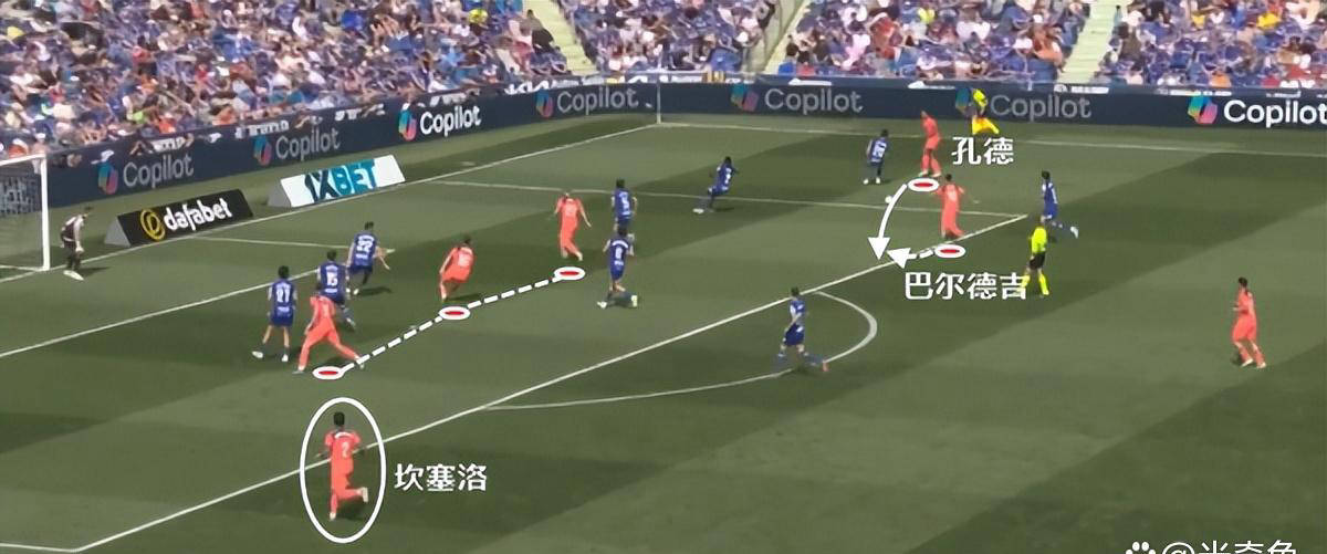 คุณภาพการควบคุมวงกลมกลางของบาร์เซโลนาในยุคฟริคนั้นดีมาก หลังจากรับบอลในช่วงเวลาวิกฤติ ฟูลแบ็คก็เสียบมันเข้าที่ปกติอย่างรวดเร็ว สำหรับ Kongde นี่หมายความว่าเขาต้องวิ่งขึ้นและลงต่อไป โดยมีส่วนร่วมอย่างแข็งขันในการเปลี่ยนแนวรุกและแนวรับ โดยเฉพาะอย่างยิ่งเมื่อเขาร่วมมือกับยามาล ความรับผิดชอบนั้นหนักเป็นพิเศษ ไม่ว่า Yamal จะผ่านได้หรือไม่ Kongde จำเป็นต้องส่งต่อและให้การสนับสนุนอย่างรวดเร็ว ซึ่งทำให้ความต้องการด้านความแข็งแกร่งทางกายภาพและความสามารถในการวิ่งของเขาสูงมาก