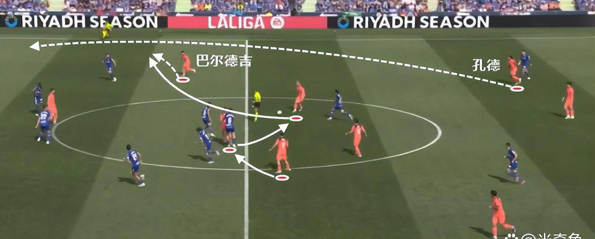 คุณภาพการควบคุมการจ่ายบอลกลางวงกลมของบาร์เซโลนาของยุคบาร์เซโลนานั้นสูงและจังหวะของปลั๊กอินอย่างรวดเร็วแบบแบ็คทูแบ็คหลังจากรับบอลบนปีกทำให้ Kongde วิ่งขึ้นและลงอย่างต่อเนื่อง โดยเฉพาะอย่างยิ่งเมื่อร่วมมือกับ Yamal นั้น Kong de จำเป็นต้องมีความรู้สึกสนับสนุนอย่างมาก ไม่ว่ายามาลจะจ่ายบอลหรือไม่ก็ตาม กงเดอ จำเป็นต้องสนับสนุนฝ่ายสนับสนุนอย่างแข็งขัน การสังเกตหยุดชั่วคราวของ Comte การข้ามที่แม่นยำและการจ่ายบอลระยะสั้นที่ยืดหยุ่นได้หลังจากถือลูกบอลทำให้เขาเป็นหุ้นส่วนในอุดมคติของ Yamal แม้ว่าคุณภาพของการป้องกันของ Comte จะลดลง แต่บาร์เซโลนาและฟริกยังคงอดทนพอที่จะคาดหวังให้เขาเสียสมดุลระหว่างการรุกและแนวรับ