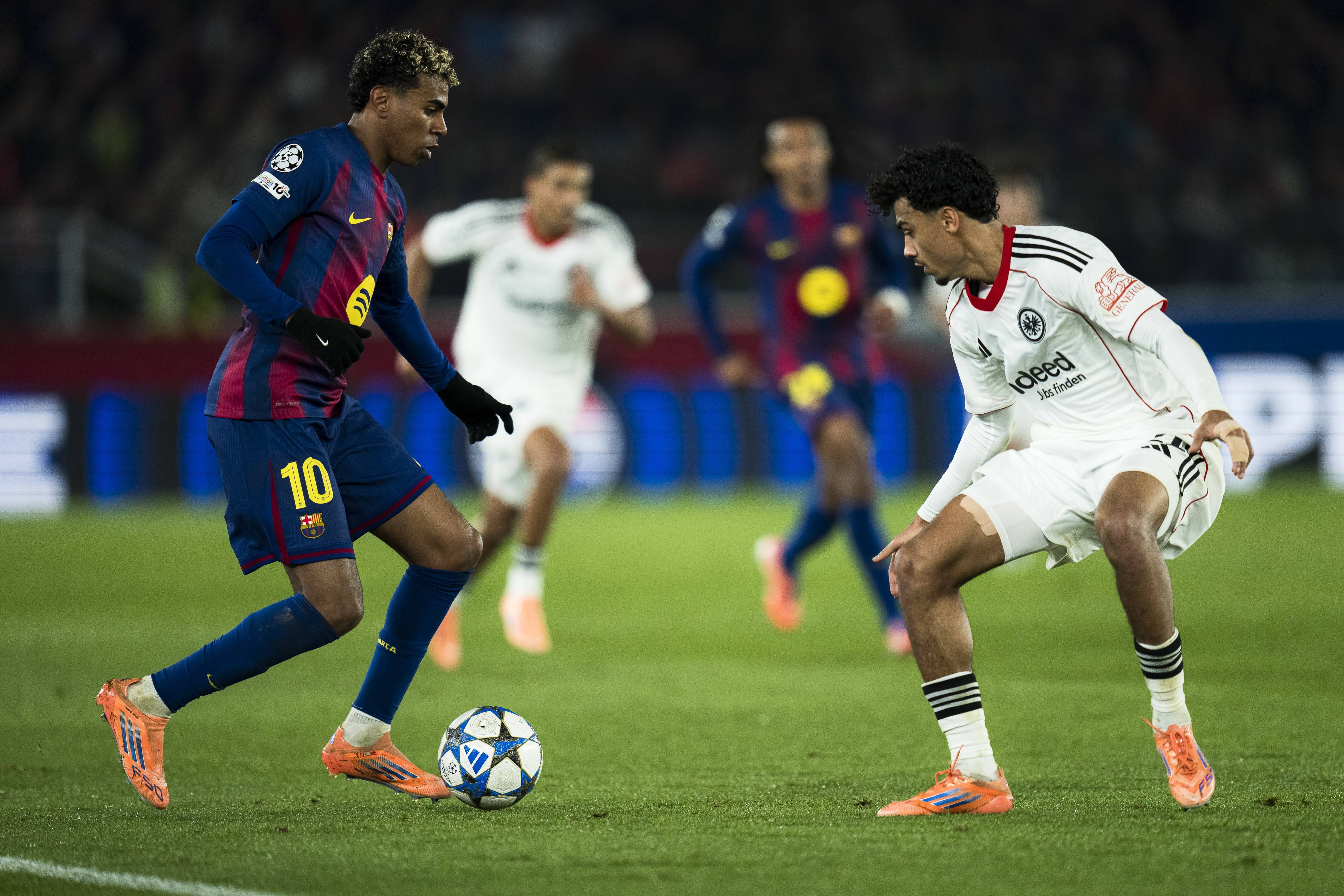 เมื่อวันที่ 9 ธันวาคม ยามาลของบาร์เซโลนา (ซ้าย) ต่อสู้เพื่อแย่งบอลกับบราวน์ของไอน์ทรัค แฟร้งค์เฟิร์ต สำนักข่าวซินหัว (ภาพโดย ฮวน โกซาร์)
