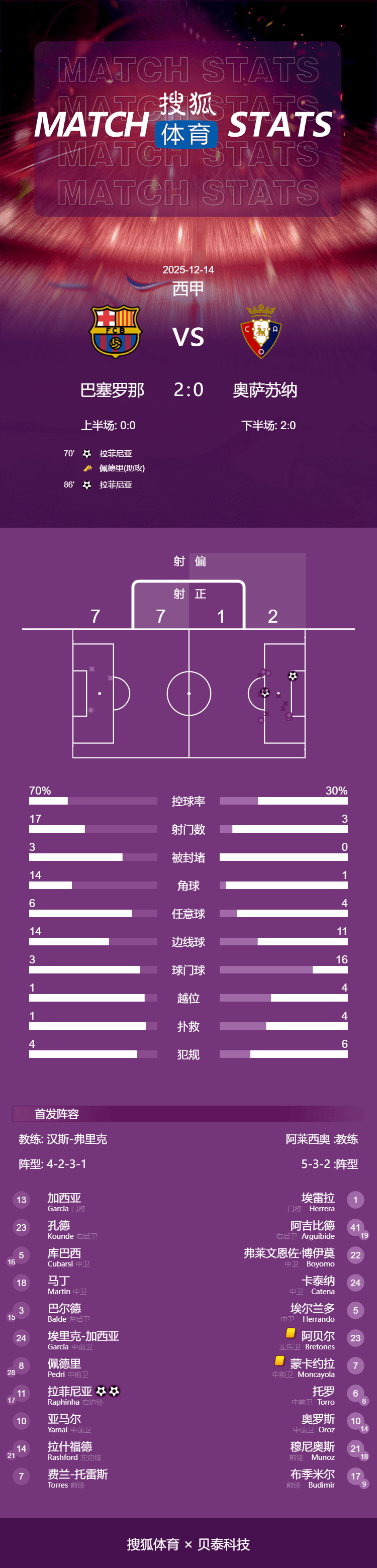 เวลา 01:30 น. ตามเวลาปักกิ่ง วันที่ 14 ธันวาคม บาร์เซโลนาเปิดบ้านต้อนรับโอซาซูนาในรอบที่ 16 ของลาลีกา ในช่วงครึ่งแรก บาร์ซ่าสร้างโอกาสอันตรายหลายครั้งแต่ไม่สามารถทำประตูได้ ทำให้สกอร์อยู่ที่ 0-0 ในช่วงพักครึ่ง ในครึ่งหลัง ราฟินญ่าทำประตูได้สองครั้งโดยมีเปดรีเป็นผู้ช่วย ทำให้บาร์เซโลนาชนะในบ้าน 2-0 ด้วยการเล่นมากกว่าคู่แข่งหนึ่งเกม บาร์ซ่าจึงนำเป็นจ่าฝูงของตารางลีกด้วยคะแนนนำ 7 คะแนน