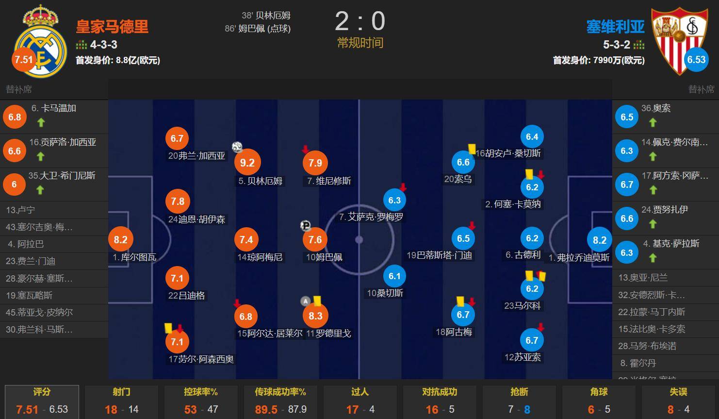 ตลอดการแข่งขัน เรอัล มาดริดครองบอล 53% ยิงทั้งหมด 18 ครั้งเข้ากรอบ 8 ครั้ง ขณะที่เซบีย่ายิงทั้งหมด 14 ครั้งเข้ากรอบ 5 ครั้งเรอัล มาดริดมีมูลค่าผู้เล่นตัวจริงรวมกันประมาณสิบเท่าของเซบีย่า แต่การแข่งขันยังคงสูสีกัน หากเรอัลต้องเผชิญกับคู่แข่งที่สูสีเช่นนี้ กลยุทธ์ของอลอนโซ่จะถูกทดสอบอย่างหนัก!