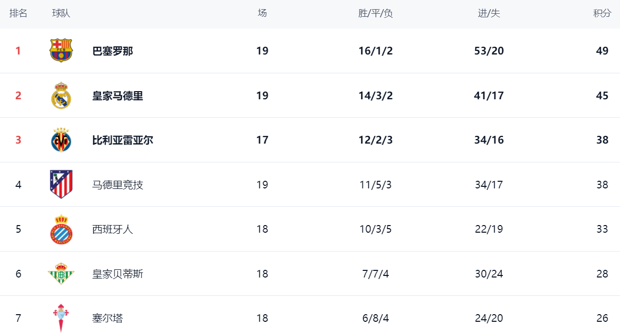 ที่ด้านบนของตาราง บาร์เซโลนายังคงครองตำแหน่งจ่าฝูงอย่างมั่นคง สถิติของพวกเขาคือ ชนะ 16 นัด เสมอ 1 นัด และแพ้ 2 นัด สะสมได้ 49 คะแนน เรอัล มาดริด ที่เพิ่งคว้าชัยชนะมาสดๆ ร้อนๆ ตามมาติดๆ ด้วยสถิติชนะ 14 นัด เสมอ 3 นัด และแพ้ 2 นัด เก็บได้ 45 คะแนน อยู่ในอันดับสอง ตามหลังอยู่ 4 คะแนนบียาร์เรอัล อยู่ในอันดับสามด้วยคะแนน 38 คะแนน แอตเลติโก มาดริด ซึ่งเสมอในเกมล่าสุด ก็มีคะแนน 38 คะแนนเช่นกัน และอยู่ในอันดับสี่ อย่างไรก็ตาม แอตเลติโกได้เล่นมากกว่าบียาร์เรอัลสองนัด เอสปันญอล ทำผลงานได้ยอดเยี่ยมในฤดูกาลนี้ โดยเก็บคะแนนได้ 33 คะแนน อยู่ในอันดับห้า เรอัล เบติส อยู่ในอันดับหกด้วยคะแนน 28 คะแนน