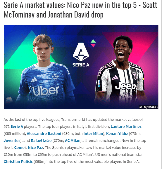การประเมินมูลค่าผู้เล่นในเซเรียอา อัปเดต: ลาอูตาโร่ยังคงเป็นอันดับหนึ่ง อินเตอร์ครองท็อปเท็นด้วยผู้เล่นห้าคน มูลค่าของเพสซิน่าพุ่งสูงขึ้นถึง 10 ล้านยูโร _โรม่า_ _ยูเวนตุส_