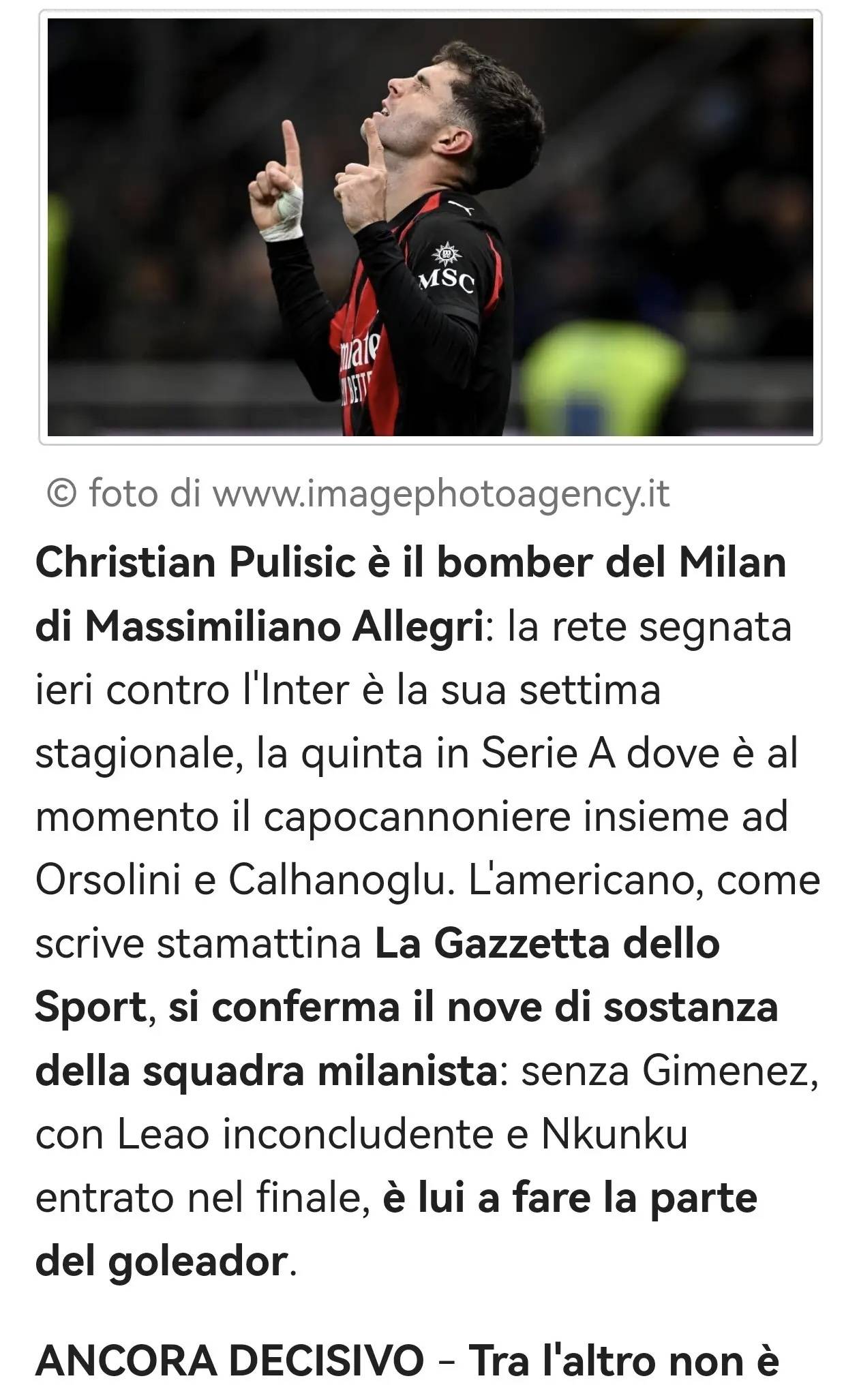 เซเรีย อา: พูลิซิชขึ้นนำตารางดาวซัลโว เสมอกับออร์โซลินีและชัลฮาโนกลูที่พลาดจุดโทษ ในศึกมิลานดาร์บี้ ประตู อินเตอร์