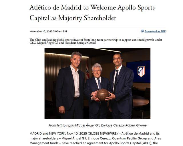 บริษัทไพรเวทอิควิตี้ชั้นนำแห่งวอลล์สตรีทคว้าดีลใหญ่ครั้งแรกในวงการกีฬา: เข้าซื้อหุ้นส่วนน้อยในแอตเลติโก มาดริด ทีมยักษ์ใหญ่แห่งลาลีกา
