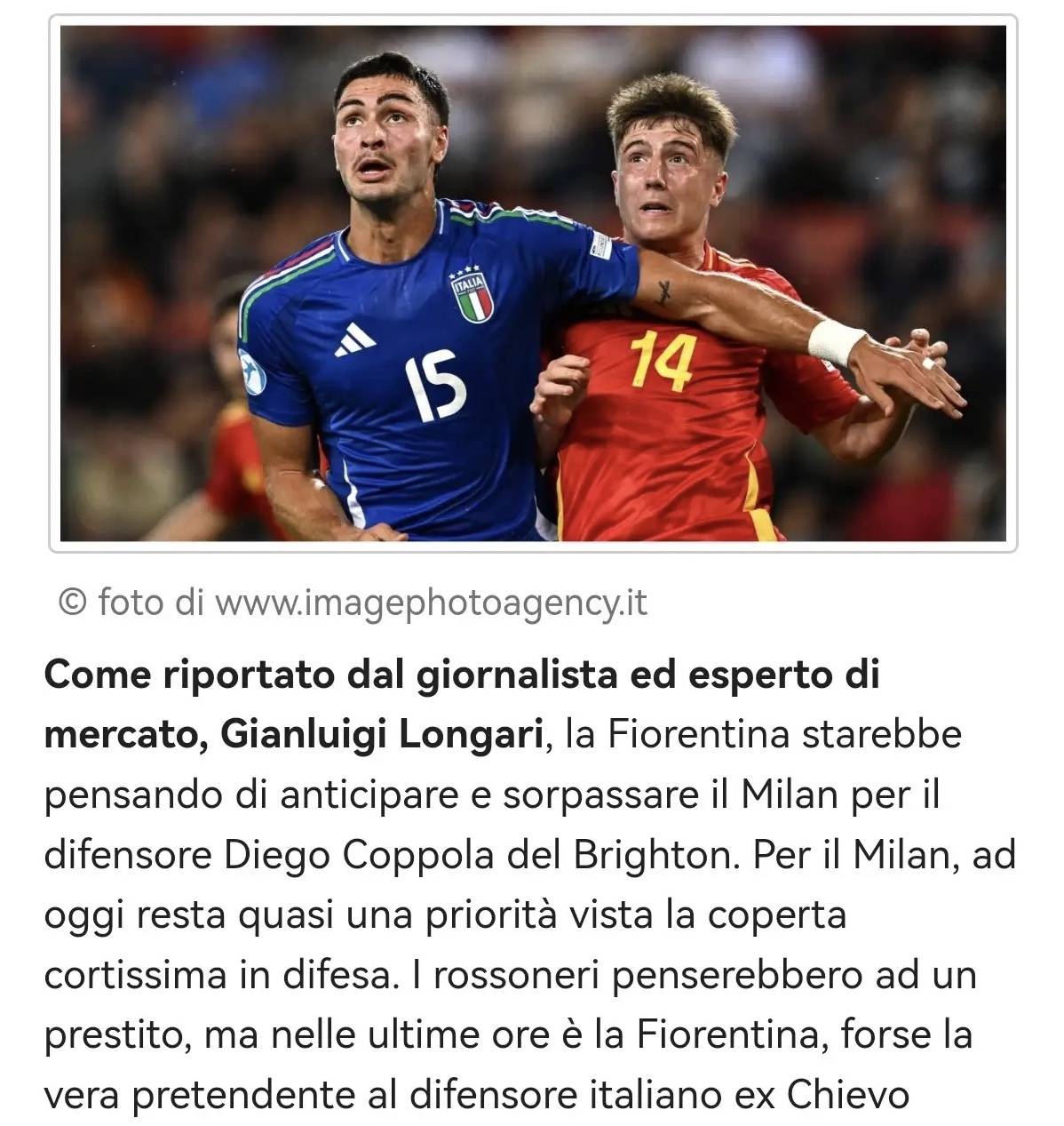 สื่ออิตาลีรายงาน: ฟิออเรนตินามุ่งหวังที่จะตัดหน้าเอซี มิลานในการคว้าตัวเป้าหมายกองหลังของไบรท์ตัน แกรี่ โคโปล่า