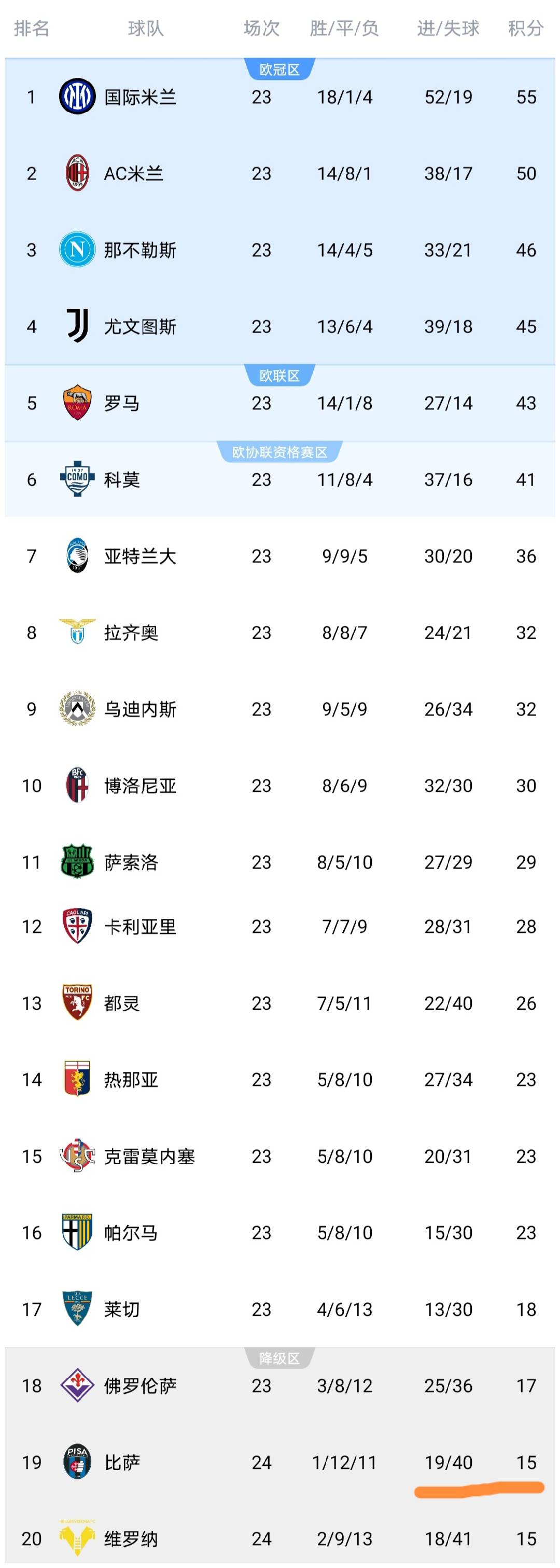 หลังจากเสมอกับเวโรนา ปิซาได้ไต่ขึ้นมาอยู่ที่ 15 คะแนน อยู่ในอันดับที่ 19 และตามหลังโซนตกชั้นอยู่ 3 คะแนน เวโรนาก็มี 15 คะแนนเช่นกัน แต่ยังคงอยู่อันดับสุดท้ายของตาราง ในกลุ่มสี่อันดับแรกของเซเรีย อา ยูเวนตุสครองอันดับที่ 4 ตามหลังนาโปลีอันดับ 3 อยู่ 1 คะแนน ขณะที่เอซี มิลานตามหลังอินเตอร์ มิลานอยู่ 5 คะแนน