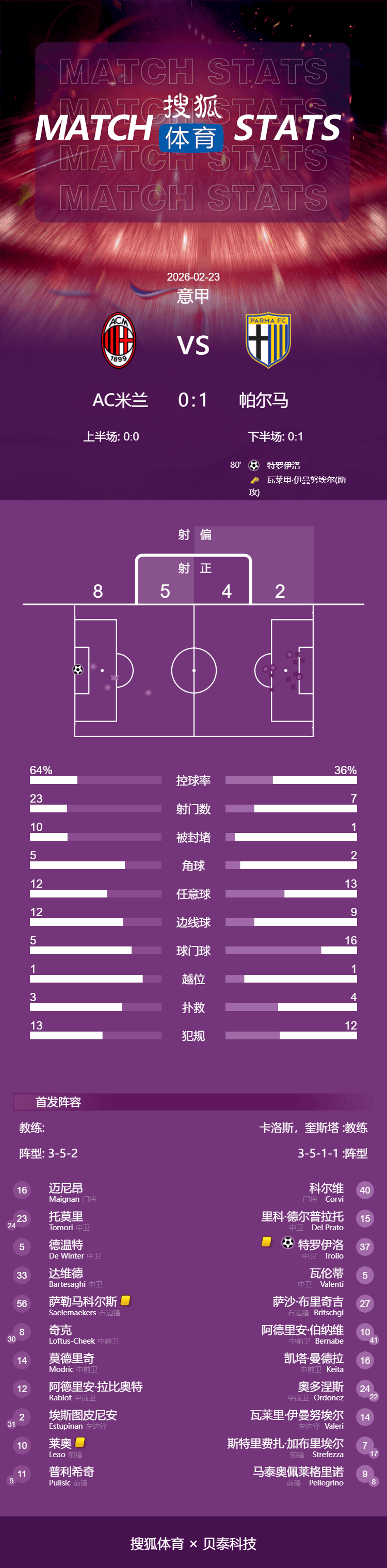 เวลา 01:00 น. ตามเวลาปักกิ่ง วันที่ 23 กุมภาพันธ์ การแข่งขันรอบที่ 26 ของฤดูกาล 2025-26 เซเรีย อา ได้เริ่มต้นขึ้นที่สนามซาน ซิโร่ ซึ่งเอซี มิลาน ทีมอันดับสอง เปิดบ้านรับการมาเยือนของปาร์มาครึ่งแรกทั้งสองทีมผลัดกันโจมตี โดยมิลานยิงชนเสาหลายครั้งแต่ไม่สามารถทำประตูได้ หลังจากผ่านพ้นช่วงเวลาที่ยากลำบากในครึ่งหลัง ปาร์ม่าก็ทำประตูชัยได้สำเร็จผ่านทรอยโล่ ในที่สุด เอซี มิลานก็พ่ายแพ้คาบ้านอย่างน่าตกใจ 0-1 ต่อปาร์ม่า หลังจากผลการแข่งขันนี้ เอซี มิลานตามหลังอินเตอร์ มิลานจ่าฝูงของตารางคะแนนถึง 10 คะแนน