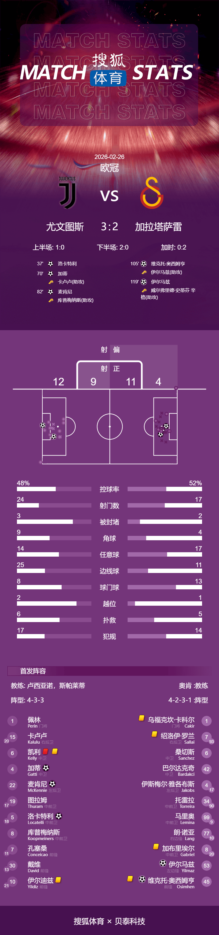 เวลา 04:00 น. ตามเวลาปักกิ่ง วันที่ 26 กุมภาพันธ์ ยูเวนตุสเปิดบ้านรับการมาเยือนของกาลาตาซาราย ที่สนามอัลลิอันซ์ สเตเดียม ในรอบเพลย์ออฟน็อคเอาท์ของยูฟ่าแชมเปียนส์ลีก ฤดูกาล 2025-26 โดยยูเวนตุสพ่ายแพ้ให้กับกาลาตาซารายไป 2-5 ในนัดแรกครึ่งแรกเป็นการแข่งขันที่ดุเดือดจากทั้งสองฝ่าย โดยโลคาเตลลีทำประตูแรกให้ยูเวนตุสจากจุดโทษ ในครึ่งหลัง แม้จะเหลือผู้เล่นเพียงสิบคน ยูเวนตุสก็ตีเสมอได้สำเร็จจากการทำประตูของกัตติและแม็คเคนนี่ ทำให้สกอร์รวมเสมอกันการแข่งขันเข้าสู่ช่วงต่อเวลา ในช่วงต่อเวลา ยูเวนตุสพลาดโอกาสทำประตูที่ชัดเจนหลายครั้ง โอดิออน อิกาโล ทำประตูได้ในครึ่งแรกของช่วงต่อเวลา ขณะที่บูรัค ยิลมาซ ยิงประตูชัยในช่วงท้ายของการต่อเวลาครึ่งหลัง ทำให้ยูเวนตุสพ่ายแพ้ด้วยสกอร์รวม 5-7 และไม่สามารถผ่านเข้าสู่รอบ 16 ทีมสุดท้ายของแชมเปียนส์ลีกได้