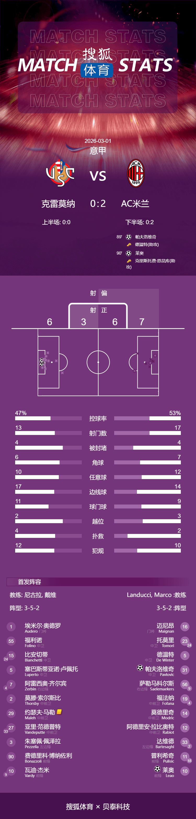 เวลา 19:30 น. ตามเวลาปักกิ่ง วันที่ 1 มีนาคม ฤดูกาล 2025-26 รอบที่ 27 ของเซเรีย อา ทีมเครโมเนเซ่ อันดับที่ 17 เปิดบ้านรับการมาเยือนของเอซี มิลาน ทีมอันดับที่ 2 ที่สนามสตาดิโอ จิโอวานนี ซินีครึ่งแรกทั้งสองทีมเปิดเกมแลกกันสนุก โดยเครโมเนเซ่มีโอกาสยิงชนเสาถึงสองครั้ง ขณะที่มิลานได้โอกาสจากปูลิซิชและโฟฟาน่าที่ยิงชนคานและเสาตามลำดับ แต่ไม่มีทีมใดสามารถทำประตูขึ้นนำได้หลังจากสถานการณ์ที่หยุดชะงักยาวนานในครึ่งหลัง มิลานสามารถคว้าชัยชนะในช่วงท้ายเกมได้จากปาฟโลวิชและเลเอาที่ยิงสองประตูในช่วงท้ายเกม เอซี มิลาน เอาชนะ เครโมเนเซ่ 2-0 ในเกมเยือน รักษาการไล่ตามจ่าฝูงของลีกต่อไป