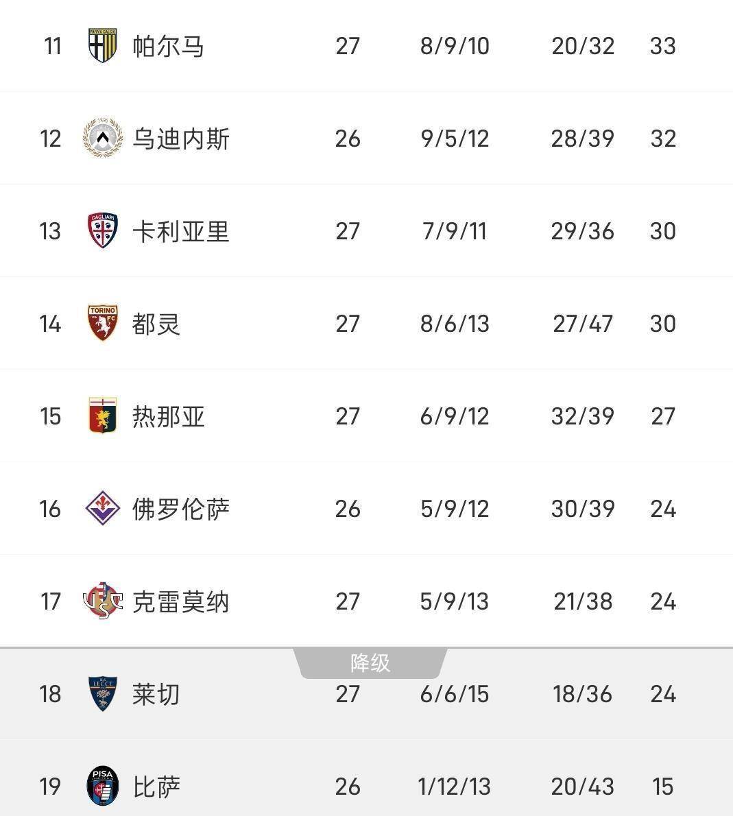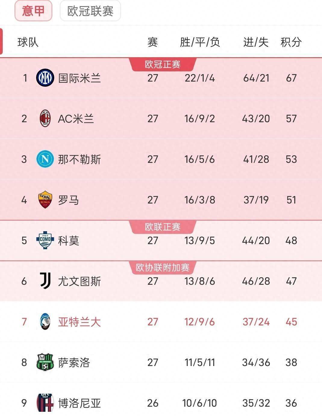 ยูเวนตุสถูกปรับลดชั้นไปอยู่อันดับที่หก โดยมีคะแนนสะสม 47 คะแนน ไม่เพียงแต่ทำให้พวกเขาหลุดจากเส้นทางการลุ้นแชมป์ แต่ยังต้องเผชิญกับการต่อสู้ที่ยากลำบากเพื่อคว้าตำแหน่งในแชมเปียนส์ลีกอีกด้วย จากตำแหน่งผู้นำที่แข็งแกร่งของอินเตอร์บนยอดตาราง ไปจนถึงการแย่งชิงอย่างดุเดือดภายในช่องว่างเพียง 10 คะแนนระหว่างอันดับสองถึงอันดับหก ภูมิทัศน์ของเซเรียอาไม่เคยชัดเจนขนาดนี้มาก่อน: ส่วนบนของตารางยังคงแน่นหนาอย่างดุเดือด ในขณะที่กลางตารางกำลังต่อสู้กันอย่างบ้าคลั่งเพื่อความอยู่รอด