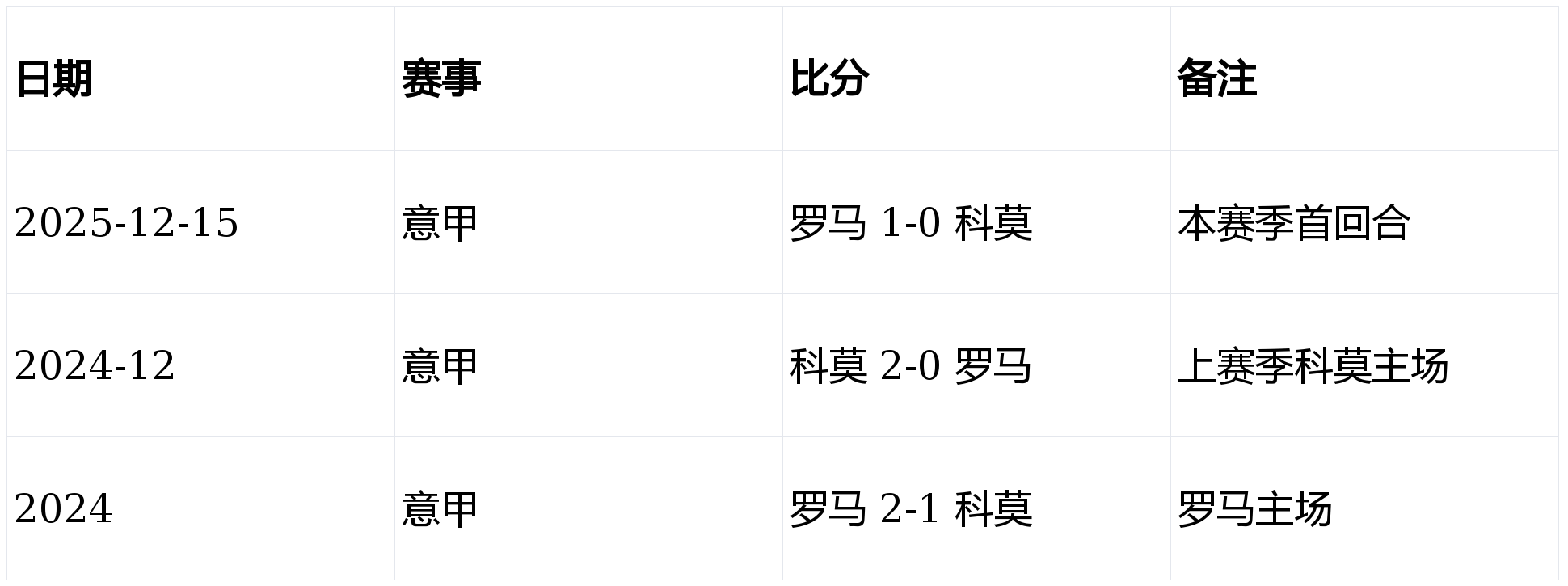 - 科莫主场对阵罗马:近两次主场交手全胜,打入3球失0球