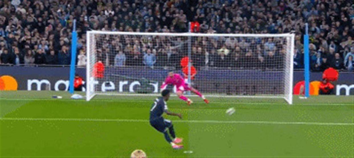 ยืนก่อนจุดโทษคือวินิซิอุส เพิ่งเสียจุดโทษไปเมื่ออาทิตย์ที่แล้ว คราวนี้โดยไม่ลังเลเลย เขาวิ่ง ยิงประตู และบอลพุ่งตรงไปที่มุมขวาล่าง ดอนนารุมุตัดสินผิดทาง 1-0 เรอัล มาดริด ขึ้นนำในเกมเยือน และสกอร์รวมเป็น 4-0
