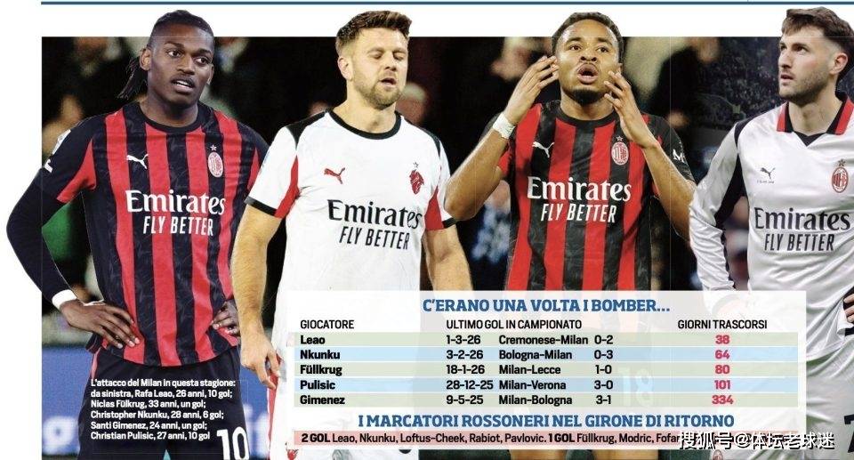 ประตูของ Enkunku มากกว่า 64 วัน และประตูสุดท้ายของ Frenchman คือกับ Bologna เมื่อวันที่ 3 กุมภาพันธ์ 2026 แต่เป้าหมายสุดท้ายของเขาในการต่อสู้กีฬาสามารถย้อนกลับไปได้ในวันที่ 11 มกราคม 2026 กับ Florence กล่าวอีกนัยหนึ่ง หากการเตะลูกโทษถูกทิ้ง ช่วงของช่วงการให้คะแนนการต่อสู้กีฬาของ Encunku นั้นน่าทึ่งยิ่งกว่า การขาดแคลนเป้าหมายที่ "อ่อนเยาว์" ที่สุดเป็นของลีโอ เมื่อวันที่ 1 มีนาคม 2026 เขายิงประตูในเกมเยือนกับ Cremona ซึ่งกลายเป็นประตูสุดท้ายของกองหน้าทั้งหมดในเอซีมิลาน เมื่อ 38 วันก่อน