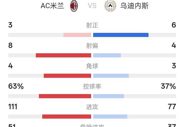 มิลานยิงเข้ากรอบได้เพียง 3 นัด ยิงเข้าเป้า 20 นัด ขณะที่อูดิเนเซ่ ยิง 3 ประตู ยิงเข้าเป้า 12 นัด การโจมตีที่อันตราย 52 ครั้งของมิลานนั้นเหมือนกับแมลงวันตัวต่อตัว และ Udinese 37 โจมตีอันตรายเพื่อดูเลือด อัตราการครอบครองบอล 63%? ไร้ความหมาย