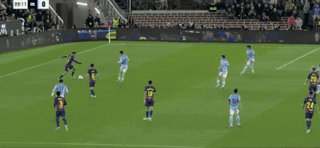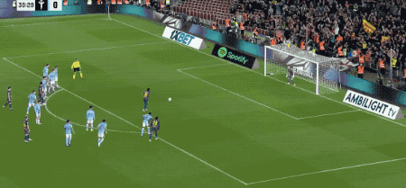 ในนาทีที่ 29 จุดหยุดและผ่านของ Ferran Torres นั้นค่อนข้างแยบยล ยามาลยิงประตูหลังครั้งแรก และบอลพลาดเล็กน้อย