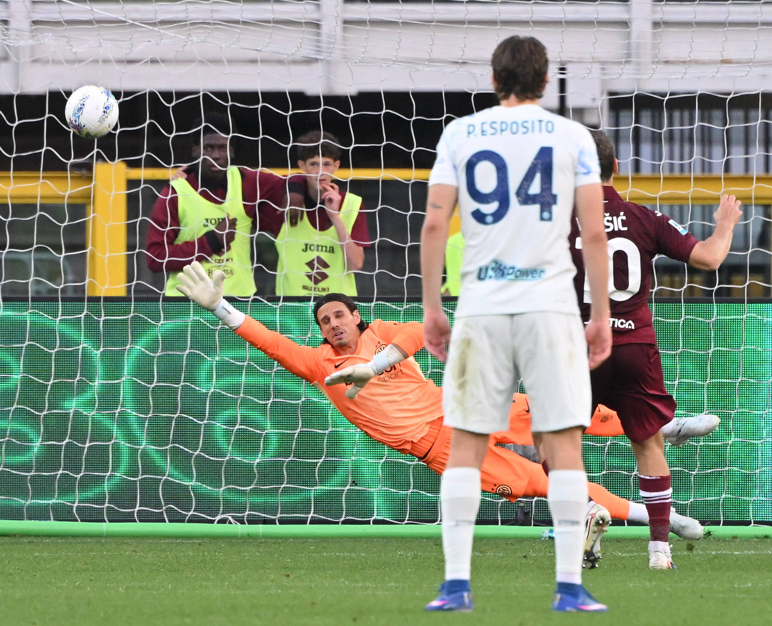 26 เมษายน ผู้เล่น Torino Frasic (ขวา) ทำลายประตูในเกม สำนักข่าวซินหัว (ภาพโดย Alberto Linglia)
