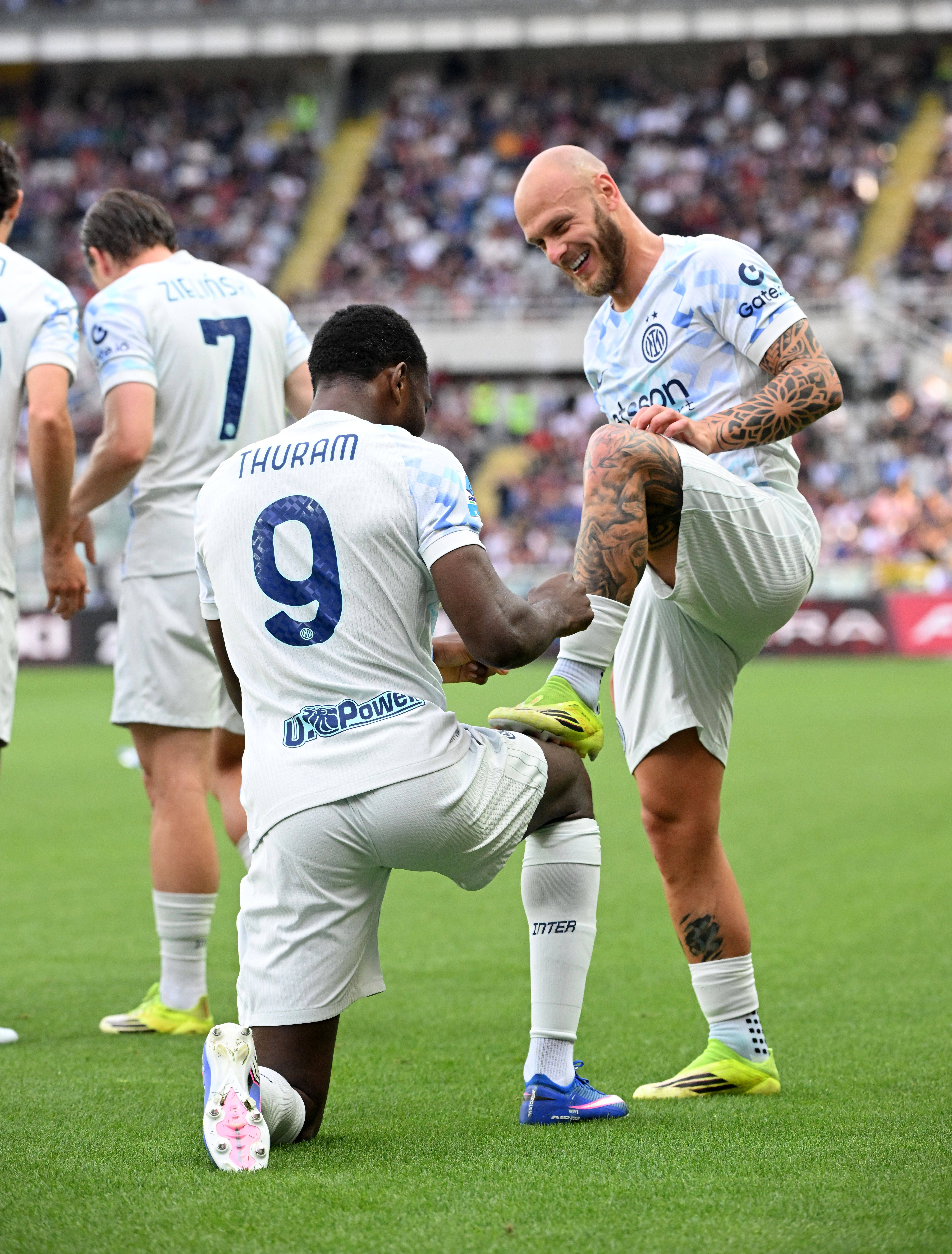ผู้เล่นอินเตอร์ มิลาน ทูรัม เมื่อวันที่ 26 เมษายน (ด้านหน้าซ้าย) เฉลิมฉลองกับเพื่อนร่วมทีม ดิ มาร์โก ซึ่งให้ความช่วยเหลือเขาหลังจากทำประตูได้ สำนักข่าวซินหัว (ภาพโดย Alberto Linglia)