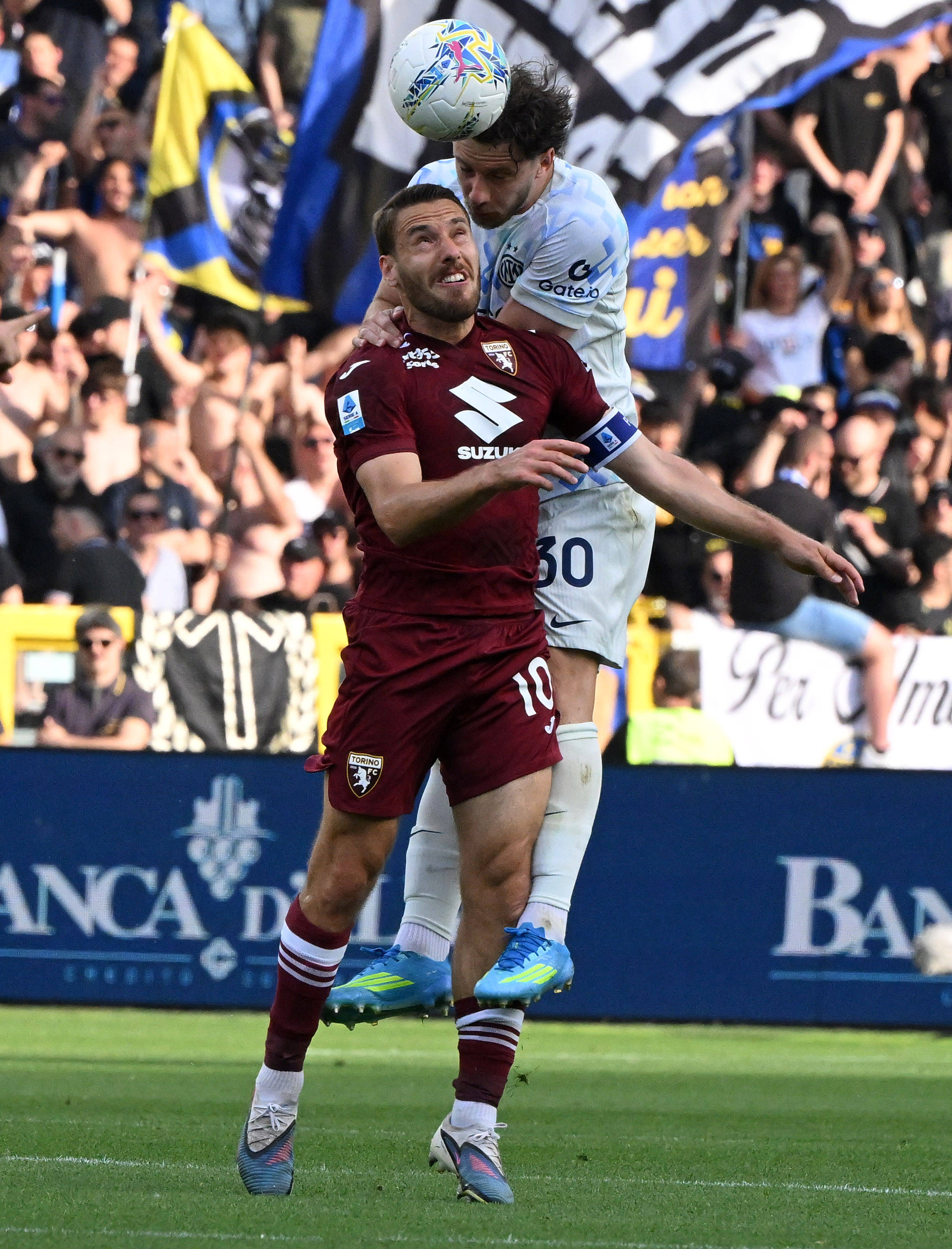 ผู้เล่นอินเตอร์ มิลาน ทูรัม ในวันที่ 26 เมษายน (ตอนที่ 1) โหม่งในเกม สำนักข่าวซินหัว (ภาพโดย Alberto Linglia)