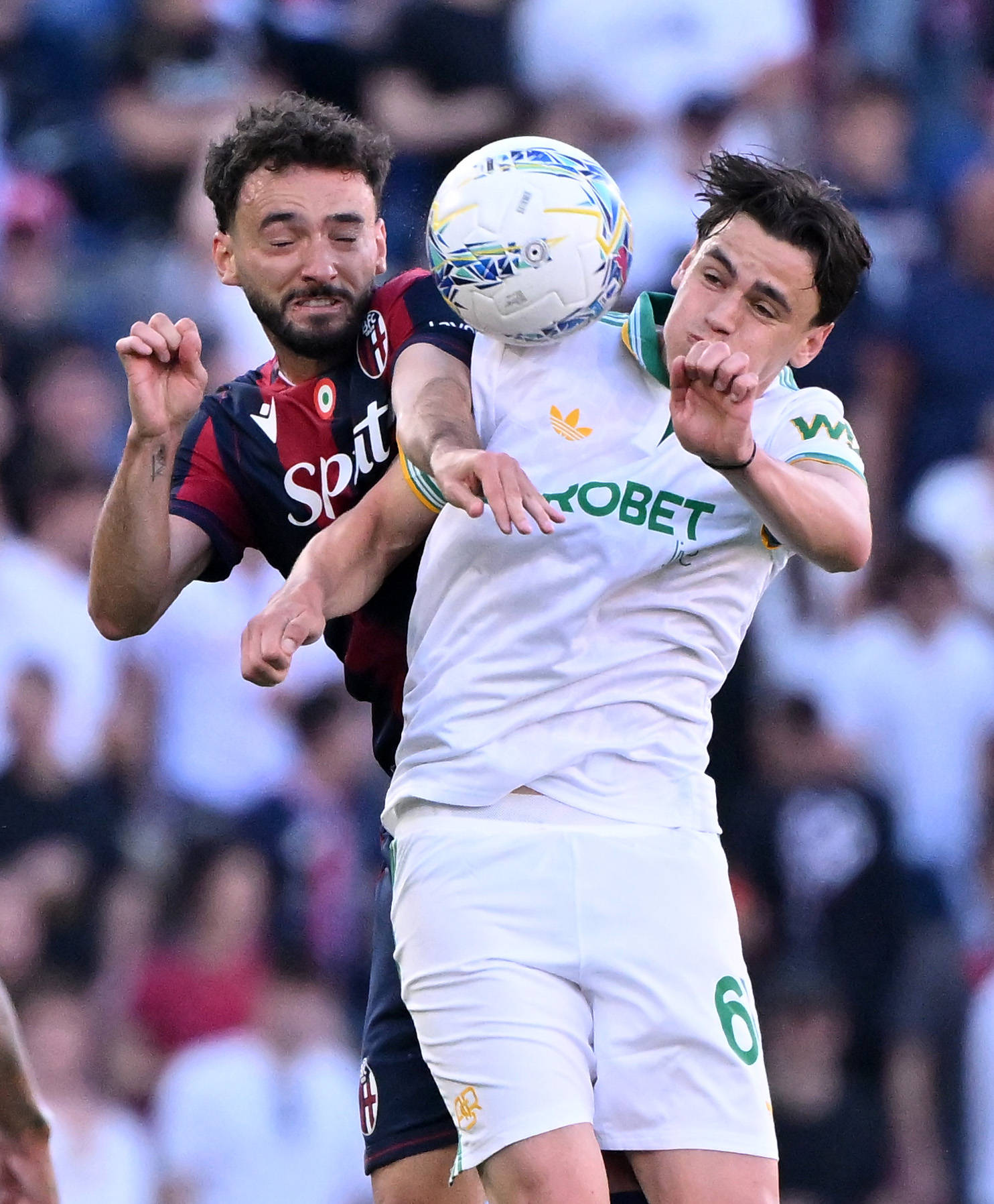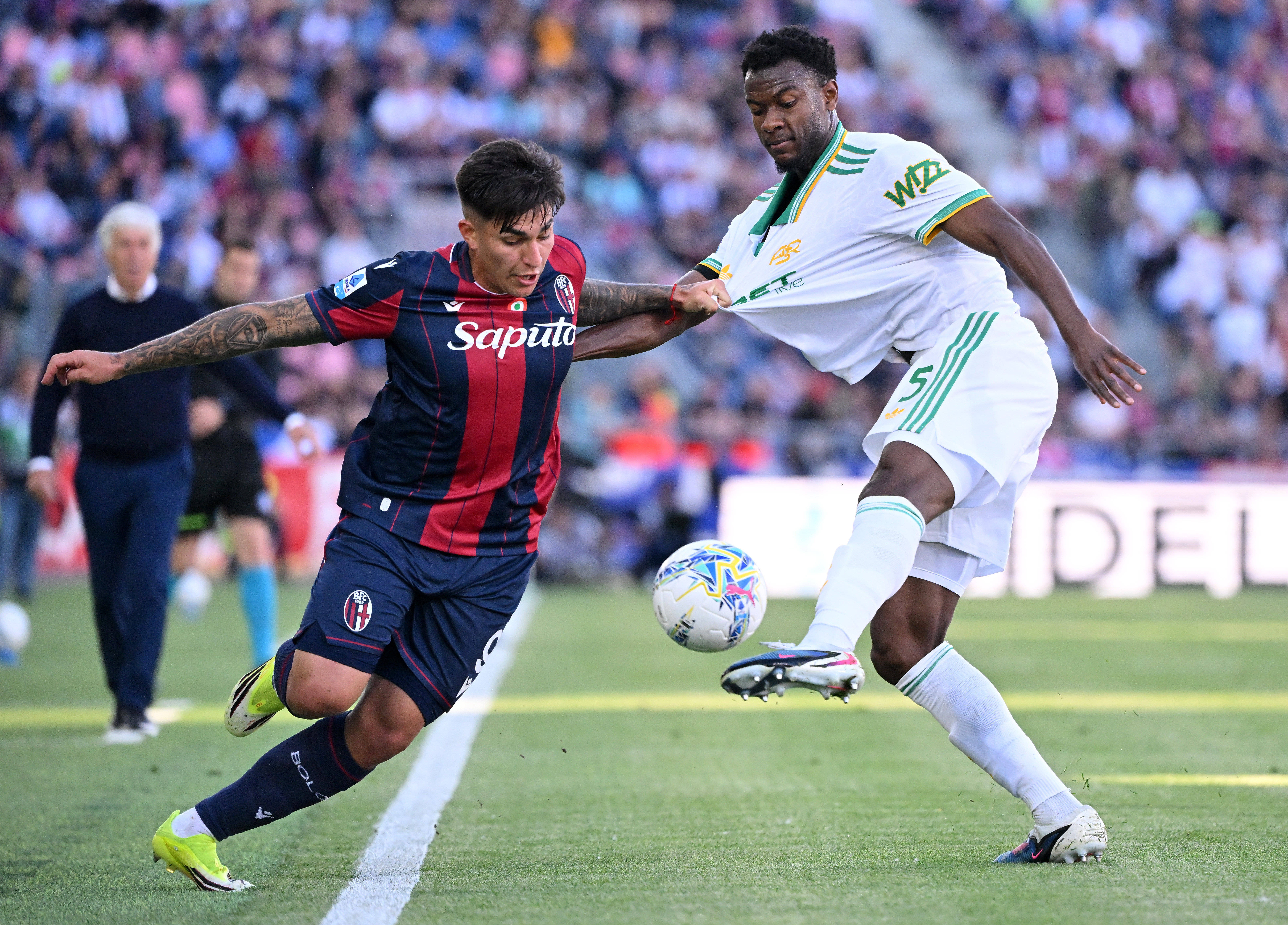 ผู้เล่น Roma Endika เมื่อวันที่ 25 เมษายน (ขวา) ต่อสู้กับ Castro ของ Bologna ในเกม สำนักข่าวซินหัว (ภาพโดย Alberto Linglia)