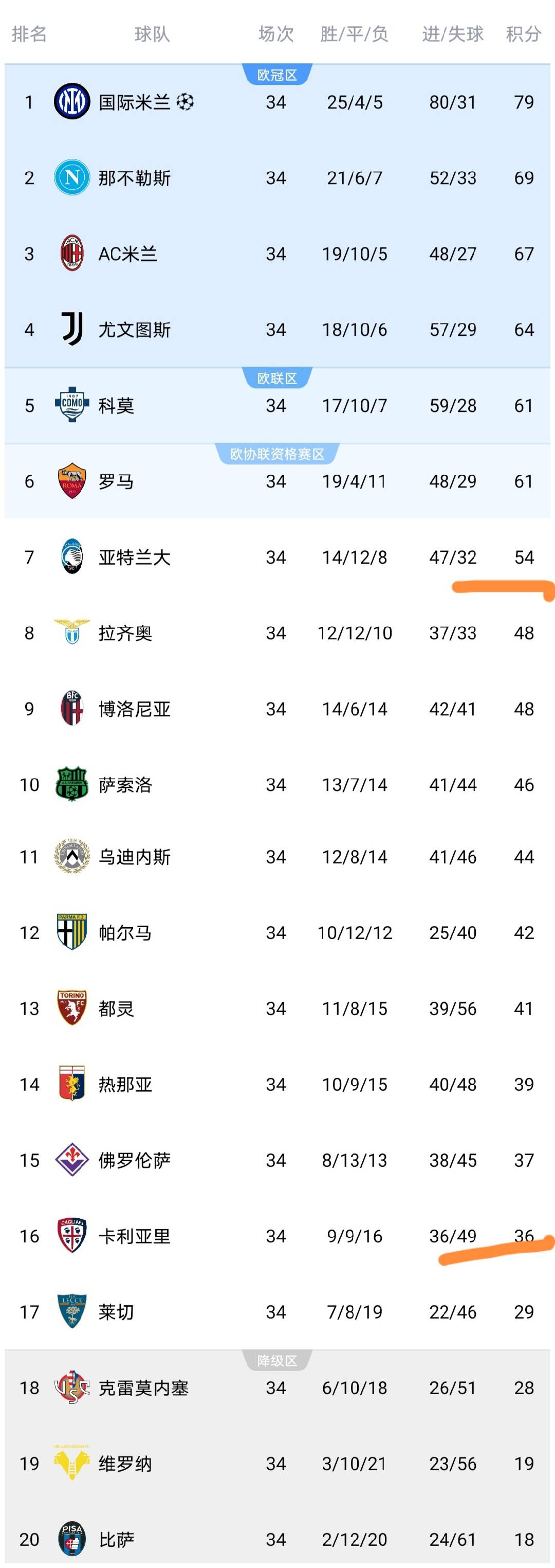 อัปเดตอันดับกัลโช่: คุณจะเห็นว่าหลังจากแอตแลนต้าแพ้ คะแนนอยู่ที่ 54 แต้ม ห่างจากโรงละครยุโรป 7 แต้ม และหลังจากที่คาลิอารีชนะ คะแนนก็เพิ่มขึ้นเป็น 36 แต้ม ทิ้งโซนตกชั้นไป 8 แต้ม