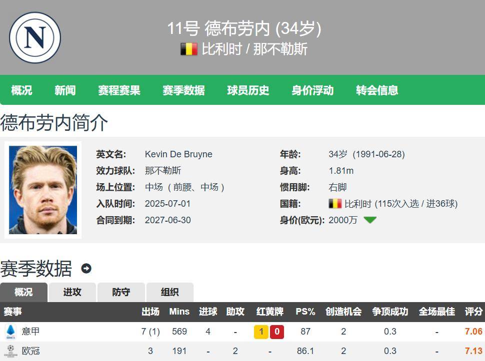 นาโปลีได้ยืนยันว่า เควิน เดอ บรอยน์ ได้รับบาดเจ็บรุนแรงที่กล้ามเนื้อต้นขาด้านหลังขวา รายงานระบุว่า กองกลางชาวเบลเยียมจะต้องพักรักษาตัวอย่างน้อยสามเดือน และอาจนานกว่านั้น ตามรายงานของสื่ออิตาลี La Gazzetta dello Sport ผลการตรวจ MRI ของเดอ บรอยน์น่าเป็นห่วง โดยพบอาการตึงกล้ามเนื้ออย่างรุนแรงที่อาจต้องได้รับการผ่าตัด ผู้เล่นคาดว่าจะไม่สามารถลงสนามได้เป็นเวลาอย่างน้อยสามเดือน