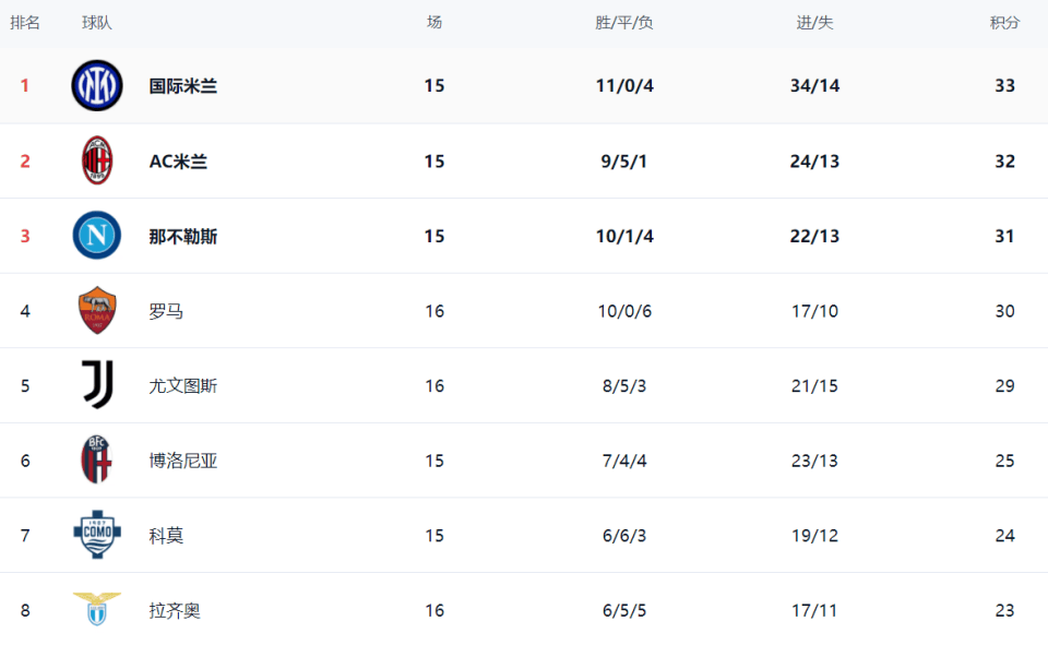 ปัจจุบัน อินเตอร์ มิลาน นำเป็นจ่าฝูงด้วย 33 คะแนน จาก 11 ชนะ และ 4 แพ้ ตามมาอย่างใกล้ชิดโดย เอซี มิลาน ที่มี 32 คะแนน จาก 9 ชนะ, 5 เสมอ และ 1 แพ้ นาโปลี อยู่ในอันดับสามด้วย 31 คะแนน แม้จะแพ้ แต่ โรม่า ยังคงอยู่ในอันดับสี่ด้วย 30 คะแนนหลังจากชัยชนะของพวกเขา ยูเวนตุสตอนนี้อยู่ในอันดับที่ห้าด้วย 29 คะแนน ตามหลังโรม่าเพียงหนึ่งคะแนน และพร้อมที่จะท้าทายเพื่อชิงตำแหน่งในแชมเปียนส์ลีกในรอบต่อไป โบโลญญ่าอยู่ในอันดับที่หกด้วย 25 คะแนน โคโมอยู่ในอันดับที่เจ็ดด้วย 24 คะแนน ขณะที่ลาซิโออยู่ในอันดับที่แปดด้วย 23 คะแนน