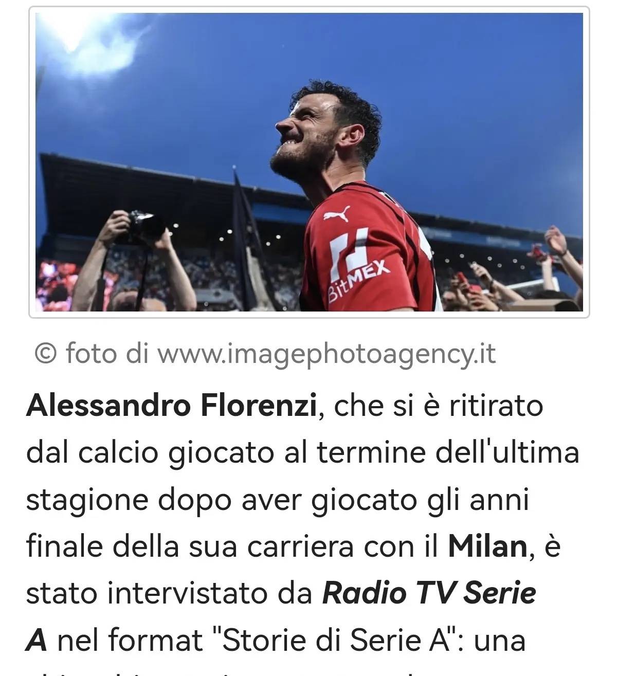 อเลฮานโดร ฟลอเรนซี่ ได้แขวนสตั๊ดเมื่อสิ้นสุดฤดูกาลที่ผ่านมา ปิดฉากอาชีพค้าแข้งกับเอซี มิลาน เขาได้ให้สัมภาษณ์กับช่อง Serie A TV ในรายการ 'Storie di Serie A' ระหว่างการพูดคุยเกี่ยวกับเส้นทางการเล่นฟุตบอลของเขา เขาไม่อาจหลีกเลี่ยงที่จะพูดถึงช่วงเวลาที่อยู่กับทีมรอสโซเนรี่ โดยเฉพาะประสบการณ์การคว้าแชมป์เซเรีย อา ในฐานะผู้เล่นคนสำคัญ