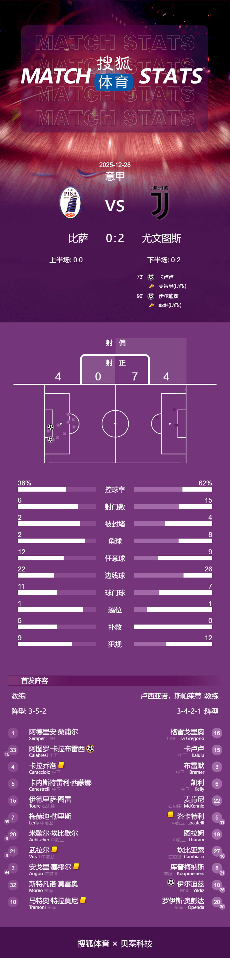 เวลา 03:45 น. ตามเวลาปักกิ่ง วันที่ 28 ธันวาคม ปิซาเป็นเจ้าบ้านต้อนรับยูเวนตุสในรอบที่ 17 ของเซเรีย อา ครึ่งแรกทั้งสองทีมต่างแลกการโจมตีแต่ไม่สามารถทำประตูได้ ครึ่งหลังยูเวนตุสสามารถเอาชนะปิซาได้ 2-0 ด้วยประตูจากคาลูและอิลดิซ
