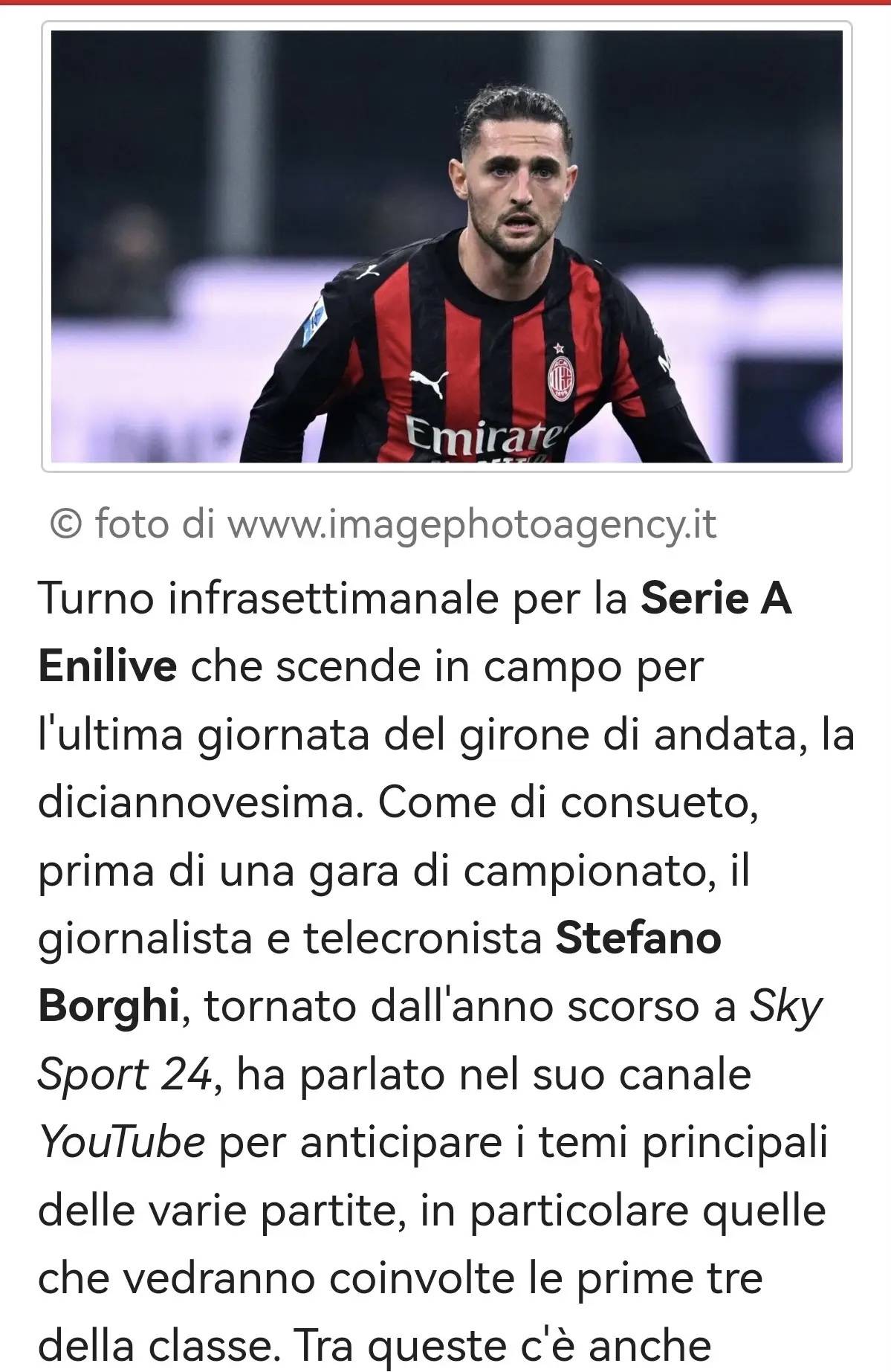 ฤดูกาลของเซเรีย อา ได้เดินทางมาถึงช่วงกลางฤดูกาลแล้ว กับการแข่งขันในรอบที่ 19 ของสัปดาห์กลางฤดูกาล ตามธรรมเนียม ก่อนที่ลีกจะกลับมาแข่งขันอีกครั้ง สเตฟาโน บอร์กี – นักข่าวและผู้บรรยายที่กลับมาสู่สกาย สปอร์ต 24 เมื่อปีที่แล้ว – ได้ทำนายไฮไลท์การแข่งขันที่สำคัญบนช่อง YouTube ส่วนตัวของเขาไว้แล้ว การวิเคราะห์ของเขาได้เน้นไปที่การแข่งขันที่เกี่ยวข้องกับทีมชั้นนำสามอันดับแรกในตารางคะแนน รวมถึงการแข่งขันในบ้านของเอซี มิลาน ในคืนวันพฤหัสบดีที่จะพบกับเจนัวที่สนามซาน ซิโร