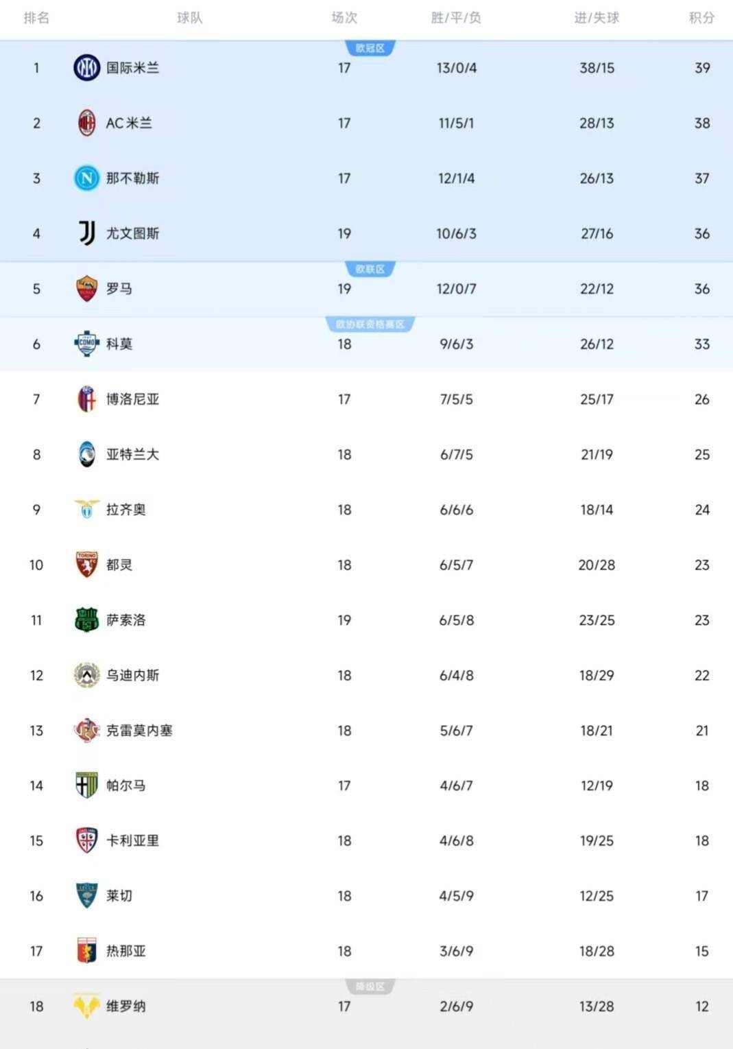 อย่างไรก็ตาม รายละเอียดที่สำคัญคือ สามทีมอันดับต้น—อินเตอร์ มิลาน, เอซี มิลาน และนาโปลี—แต่ละทีมได้ลงเล่นเพียง 17 นัดเท่านั้น ในขณะที่ยูเวนตุสซึ่งอยู่อันดับสี่ และโรม่าซึ่งอยู่อันดับห้า ได้ลงเล่นไปแล้วทั้งคู่ 19 นัด