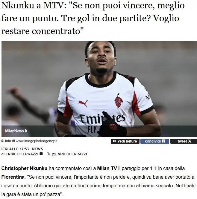 เอนคูคู! หลังจากทำประตูตีเสมอในช่วงท้ายเกมในนัดที่มิลานเสมอกับฟิออเรนติน่า เอนคูคูได้แสดงความผิดหวังกับผลการแข่งขัน "การเสมอดีกว่าการแพ้เสมอ" เขากล่าว "ผมผิดหวังที่ทีมไม่สามารถคว้าชัยชนะได้ แต่หนึ่งแต้มก็เป็นผลลัพธ์ที่ยอมรับได้"