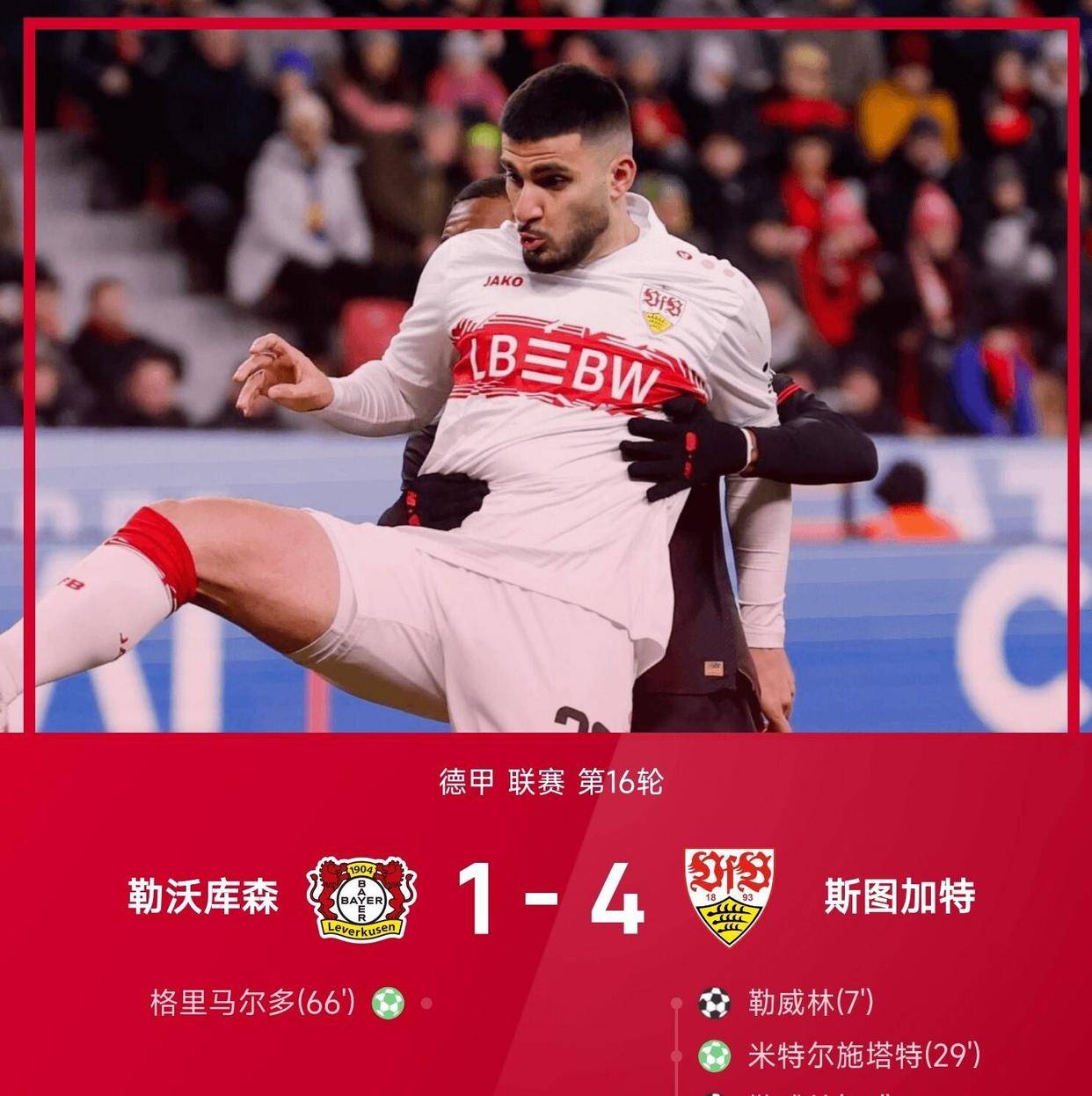ท้ายที่สุด ผลที่น่าประหลาดใจที่สุด: ไบเออร์ เลเวอร์คูเซ่น พบกับ สตุ๊ตการ์ท. ทีมเภสัชกร, หลังจากโชว์ฟอร์มอันน่าตื่นตาตื่นใจในฤดูกาลที่แล้ว, เป็นหนึ่งในทีมที่มีลุ้นแชมป์ในแคมเปญบุนเดสลีกานี้. การเป็นเจ้าบ้านรับการมาเยือนของสตุ๊ตการ์ท ใคร ๆ ก็คงคิดว่าพวกเขาไม่น่าจะพ่ายแพ้อย่างหนักเช่นนี้ได้ แต่เชื่อหรือไม่? เพียงแค่เจ็ดนาทีแรก พวกเขาก็โดนสตุ๊ตการ์ทแทงข้างหลังโดยเลวานดอฟสกี้ – 0-1 การเสียประตูเร็วขนาดนี้สามารถทำลายขวัญกำลังใจได้อย่างง่ายดาย