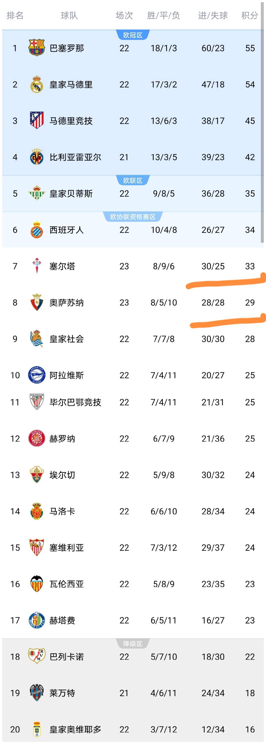 ในช่วงเช้าตรู่ของวันนี้ การแข่งขันลาลีกา รอบที่ 23 ได้จบลงเป็นคู่แรก โดยโอซาซูน่าพบกับเซลต้า บีโก้ หลังจบการแข่งขันนี้ อันดับในตารางลีกได้เปลี่ยนแปลงไป มาดูการเปลี่ยนแปลงกัน