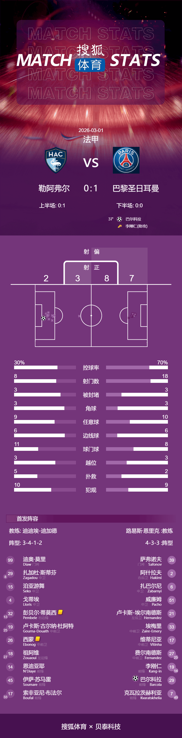 เวลา 04:05 น. ตามเวลาปักกิ่ง วันที่ 1 มีนาคม ศึกฟุตบอลลีกเอิง ฤดูกาล 2025/26 นัดที่ 24 เลอ อาฟร์ ทีมอันดับ 13 เปิดสนามสตาด โอเซอาน รับการมาเยือนของจ่าฝูง ปารีส แซงต์-แชร์กแมง ในครึ่งแรก เปแอสเชเป็นฝ่ายทำประตูขึ้นนำได้จากจังหวะประสานงานระหว่าง ลี คัง-อิน และ บาโลกูอา โดยทีมเยือนครองบอลเหนือกว่าและสร้างโอกาสทำประตูได้มากกว่าเลอ อาฟร์เพิ่มความพยายามในการโต้กลับในครึ่งหลัง แต่ไม่สามารถเจาะแนวรับที่คุมโดยผู้รักษาประตู ซานอฟ ได้ ปารีส แซงต์-แชร์กแมง พลาดโอกาสจากจุดโทษ ในที่สุด ปารีส แซงต์-แชร์กแมง คว้าชัยชนะเหนือ เลอ อาฟร์ ด้วยสกอร์ 1-0 อย่างหวุดหวิด ทำให้พวกเขายืนหยัดอยู่ในตำแหน่งจ่าฝูงของตารางลีกต่อไป