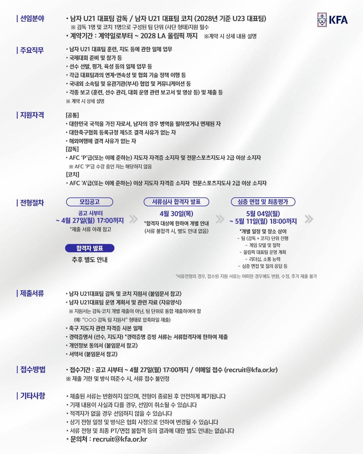 ในวันที่ 15 เมษายน สมาคมฟุตบอลเกาหลีได้ประกาศอย่างเป็นทางการว่าจะจ้างหัวหน้าโค้ชและโค้ชของทีมฟุตบอลชายแห่งชาติโอลิมปิกทั่วโลก และนำทีมไปสู่การแข่งขันกีฬาโอลิมปิกลอสแองเจลิสปี 2028 นี่เป็นครั้งที่สองที่สมาคมฟุตบอลเกาหลีได้คัดเลือกโค้ชของทีมชาติในวิธีการเปิดรับสมัคร หลัง หัวหน้าผู้ฝึกสอนของทีมชาติ U20 ของทีมฟุตบอลชาย ในการประชุมคณะกรรมการเสริมสร้างการต่อสู้ที่จัดขึ้นในเดือนกุมภาพันธ์ปีนี้สมาคมฟุตบอลเกาหลีได้ตัดสินใจปฏิรูประบบปฏิบัติการของทีมชาติโอลิมปิกแห่งชาติเปลี่ยนทีมชาติ U23 ก่อนหน้านี้ภายใต้ระบบการฝึกสอนของ Li Mincheng และคำนึงถึงการแข่งขันกีฬาโอลิมปิกและโอลิมปิกและเป็นอิสระจากทีมชาติและเริ่มต้นโดยเร็วที่สุด ดังนั้นในการออดิชั่นระดับโลกนี้ สมาคมฟุตบอล หวังชัดเจนว่าผู้สมัครจะลงชื่อในฟอร์ม "นำทีม" มากกว่าที่จะสอนคนเดียว เวลารับสมัครคือ 15 เมษายน ถึง 27 เมษายน เวลา 17.00 น. คณะกรรมการเสริมสร้างการต่อสู้จะดำเนินการประเมินผลการสัมภาษณ์เชิงลึกและประเมินผลผ่านการตรวจสอบแนวคิดการฝึกสอน คุณสมบัติทางวิชาชีพ และการเชื่อมโยงอื่นๆ หลังจากการตรวจสอบเนื้อหารอบแรก และประกาศผู้สมัครชิงชนะเลิศในต้นเดือนพฤษภาคม