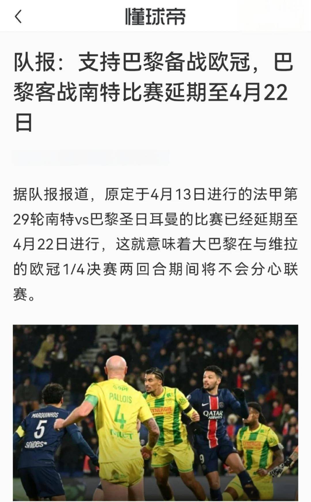 ภายใต้ "หมอกแห่งความเศร้า" นี้ พื้นหลังของเกมนี้ซับซ้อนกว่าอันดับธรรมดามาก จุดสนใจหลักสองประการของอินเทอร์เน็ตเป็นเหมือนคอร์ดของดูโอ้: แอปพลิเคชันของปารีสสำหรับการปรับตารางเวลาเพื่อเตรียมพร้อมสำหรับการต่อสู้ครั้งสำคัญของแชมเปี้ยนส์ลีกคือการประสบกับความคิดเห็นของสาธารณชนในการดึง "กลยุทธ์ที่สมเหตุสมผล" และ "สิทธิพิเศษของครอบครัวที่ร่ำรวย" ในเวลาเดียวกันโค้ช Nantes ได้บุกโจมตีสี่เกมที่ห้ามผู้ตัดสินซึ่งทำให้ทีมตกอยู่ในโซนตกชั้นมากขึ้น