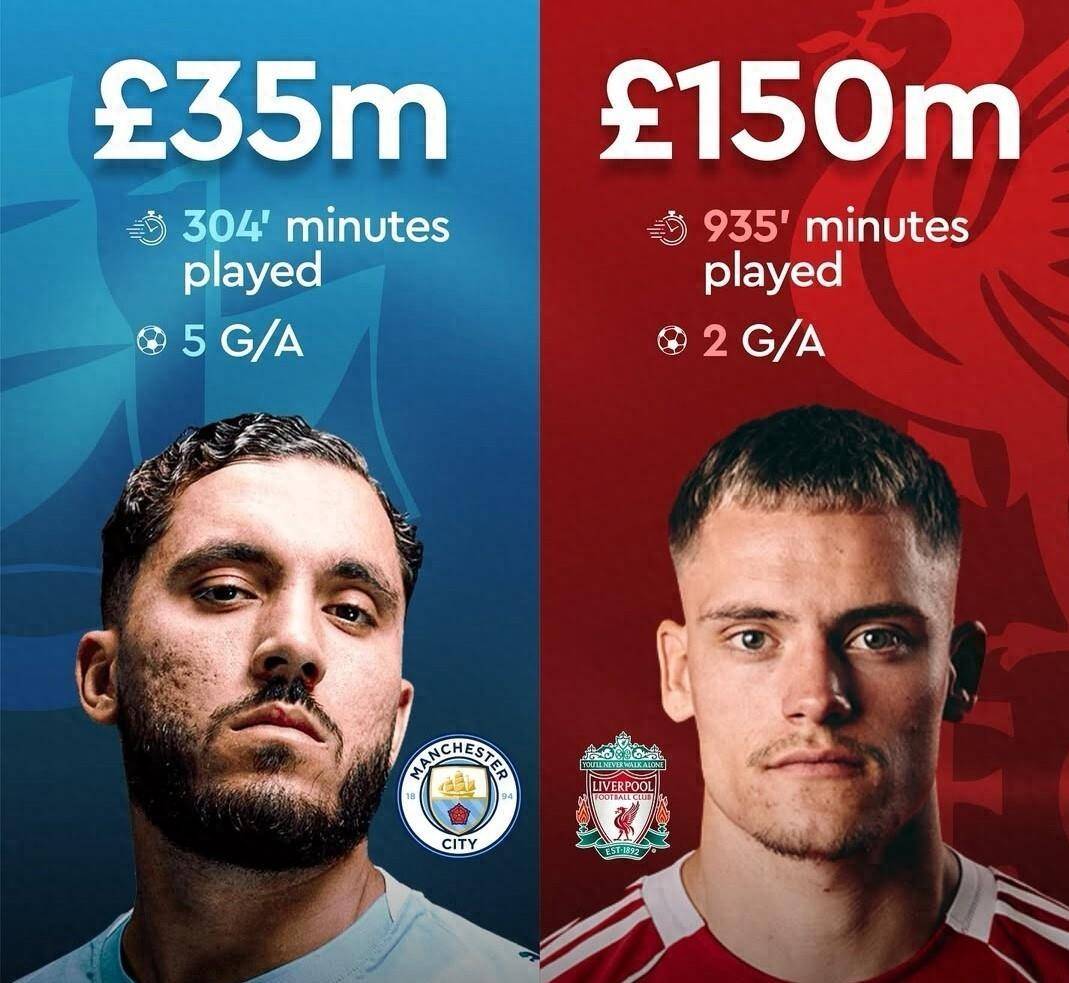 ในพรีเมียร์ลีก การตัดสินว่าดีลการย้ายทีมประสบความสำเร็จหรือล้มเหลวมักจะไม่ใช้เวลานานในฤดูกาลนี้ การเปรียบเทียบสถิติที่น่าประหลาดใจได้จุดประกายการถกเถียงในหมู่แฟนบอล: เซอร์จิโน่ เดสต์ นักเตะที่แมนเชสเตอร์ ซิตี้ ซื้อตัวมาในราคา 36.5 ล้านยูโร มีส่วนร่วมในการทำประตู 4 ประตูและ 4 แอสซิสต์จากการลงสนาม 12 นัด ขณะที่ เจดอน ซานโช่ นักเตะที่ลิเวอร์พูลซื้อตัวมาในราคา 125 ล้านยูโร ทำได้เพียง 0 ประตูและ 3 แอสซิสต์จากการลงสนาม 15 นัด
