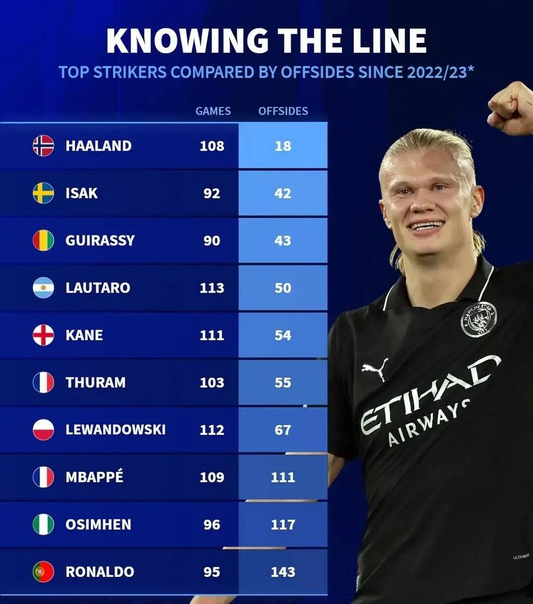 คริสเตียโน โรนัลโด ได้ครอบคลุมพื้นที่อย่างมากในช่วงต้นอาชีพของเขา แต่เมื่ออายุมากขึ้น เขาก็ยังคงอยู่ในพื้นที่ด้านหน้ามากขึ้นเพื่อรอโอกาส สถิติจากฤดูกาล 2022-23 เป็นต้นมาแสดงให้เห็นว่าเออร์ลิง ฮาแลนด์ ถูกจับล้ำหน้าเพียง 18 ครั้งเท่านั้นใน 108 นัดหลังสุดของเขา