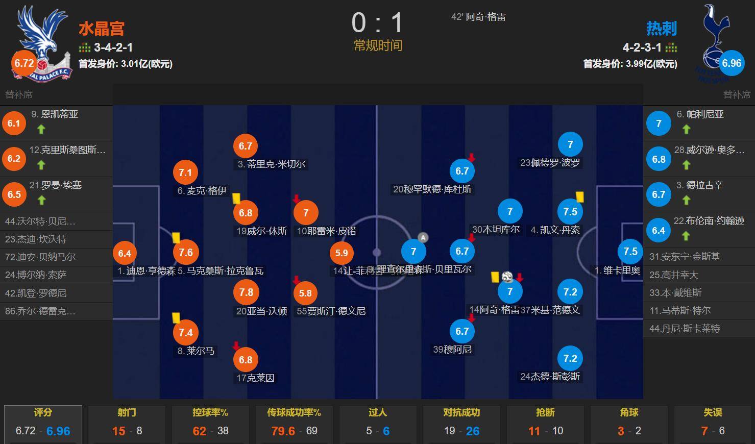 ตลอดการแข่งขัน คริสตัล พาเลซครองบอลได้ 62% ยิงทั้งหมด 15 ครั้ง โดยเข้ากรอบ 2 ครั้ง; ท็อตแนม ฮ็อตสเปอร์ยิงทั้งหมด 8 ครั้ง โดยเข้ากรอบ 4 ครั้ง