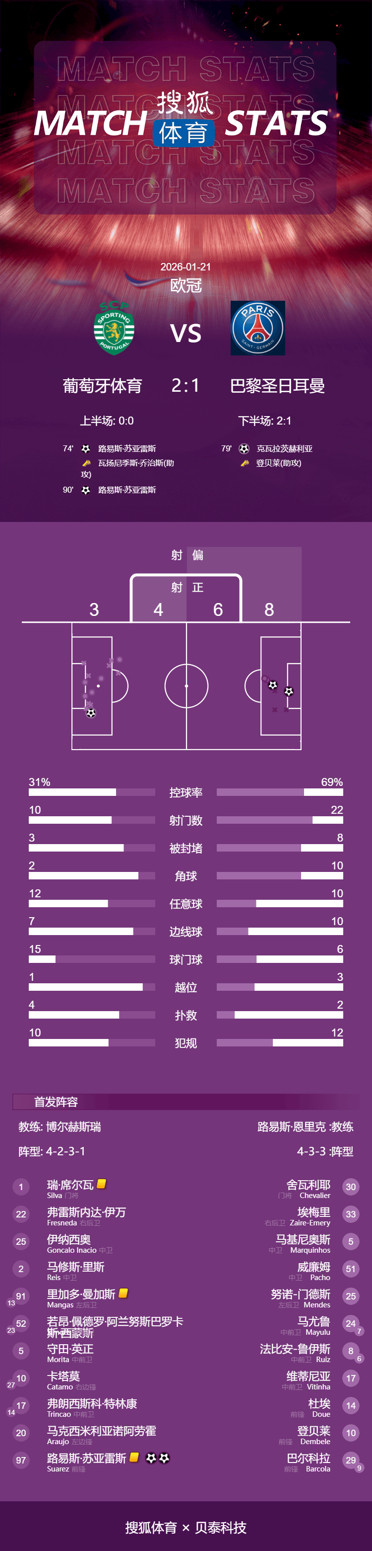 เวลา 04:00 น. ตามเวลาปักกิ่ง วันที่ 21 มกราคม การแข่งขันรอบที่เจ็ดของรอบแบ่งกลุ่มยูฟ่าแชมเปียนส์ลีก ฤดูกาล 2025-26 ได้เริ่มต้นขึ้น โดยปารีส แซงต์-แชร์กแมง พ่ายแพ้ให้กับสปอร์ติ้ง ซีพี 1-2 ในเกมเยือน ทำให้พวกเขาไม่ชนะใครในรายการนี้ติดต่อกันเป็นนัดที่สามหลุยส์ ซัวเรซ ทำประตูทำลายสกอร์ในนาทีที่ 74 โดยผู้เล่นสำรอง คเวช่า ควารัตสเคเลีย ตีเสมอ ก่อนที่ซัวเรซจะทำประตูที่สองของตัวเองในนาทีที่ 90 ทำให้ทีมชนะไปอย่างเด็ดขาด นอกจากนี้ ประตูจากอูไน เอเมรี, เมนเดส และอูสมาน เดมเบเล่ ก็ถูกยกเลิกทั้งหมด